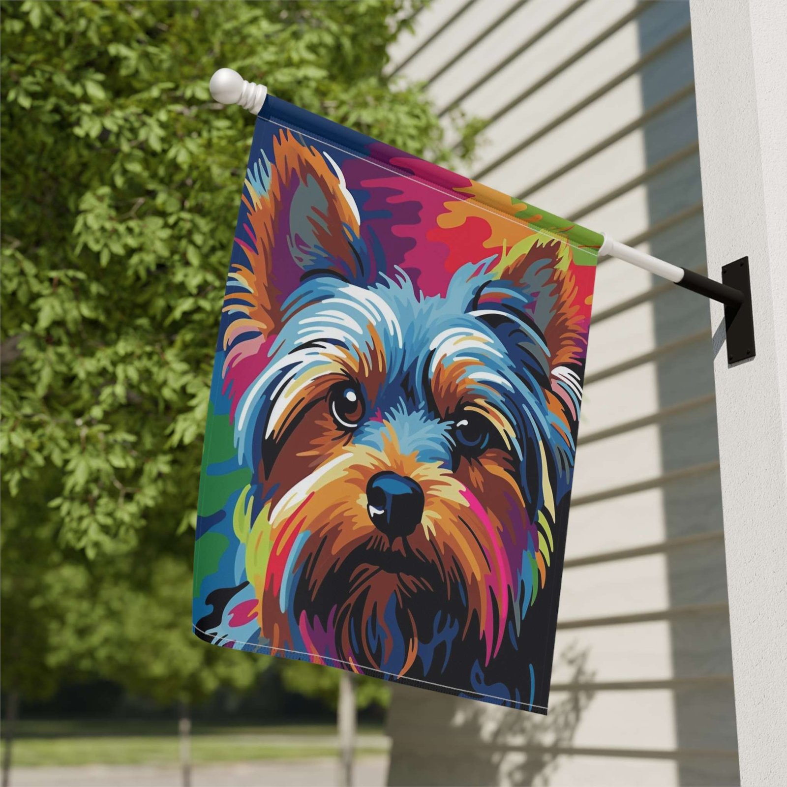 Ready to invite this charming abstract colored Yorkshire Terrier and a wave of vibrant joy into your outdoor world?