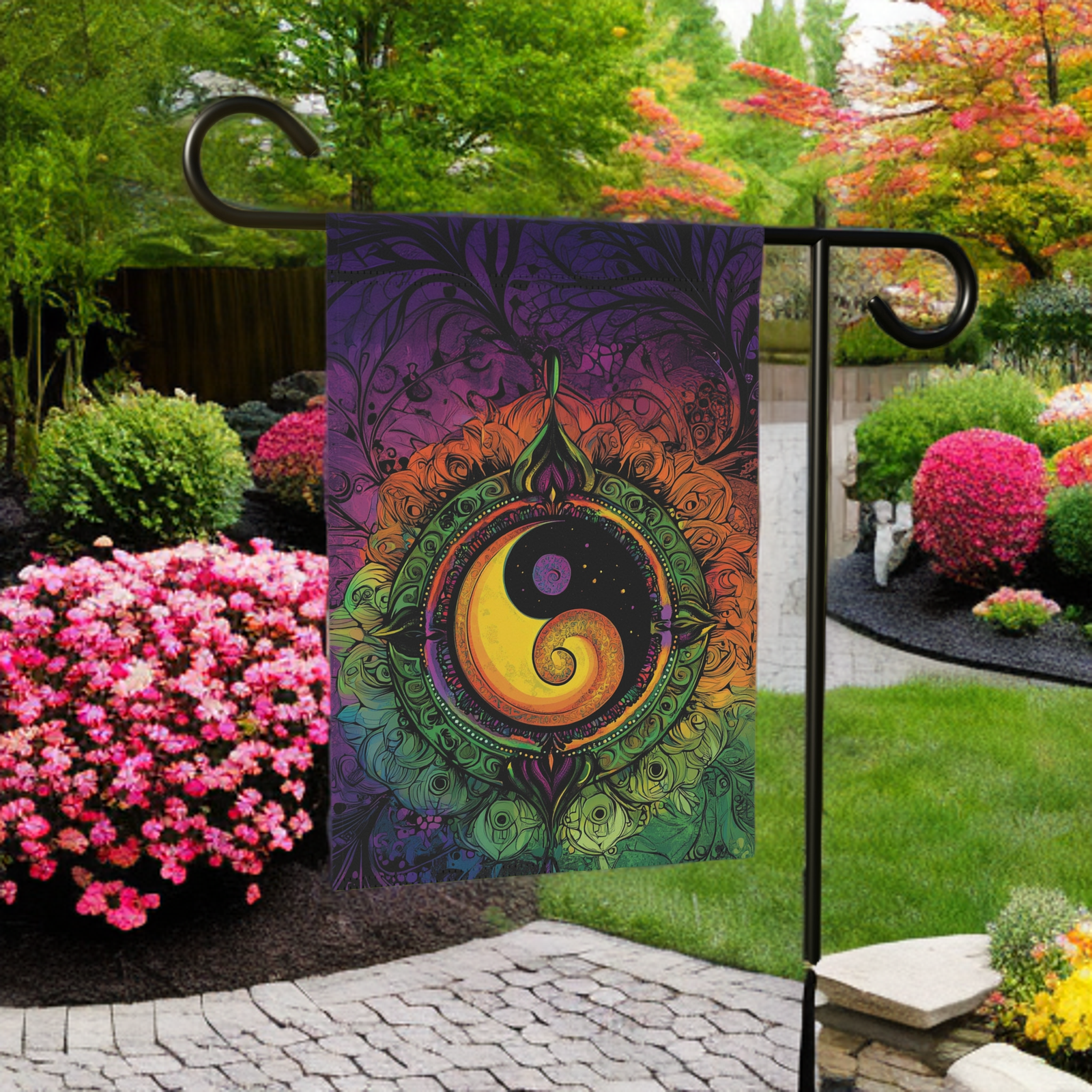 Colors That Radiate Serenity: Our advanced printing techniques ensure vibrant, crisp colors that truly bring your abstract Yin and Yang design to life, guaranteeing stunning visuals that brighten your garden and captivate every eye.