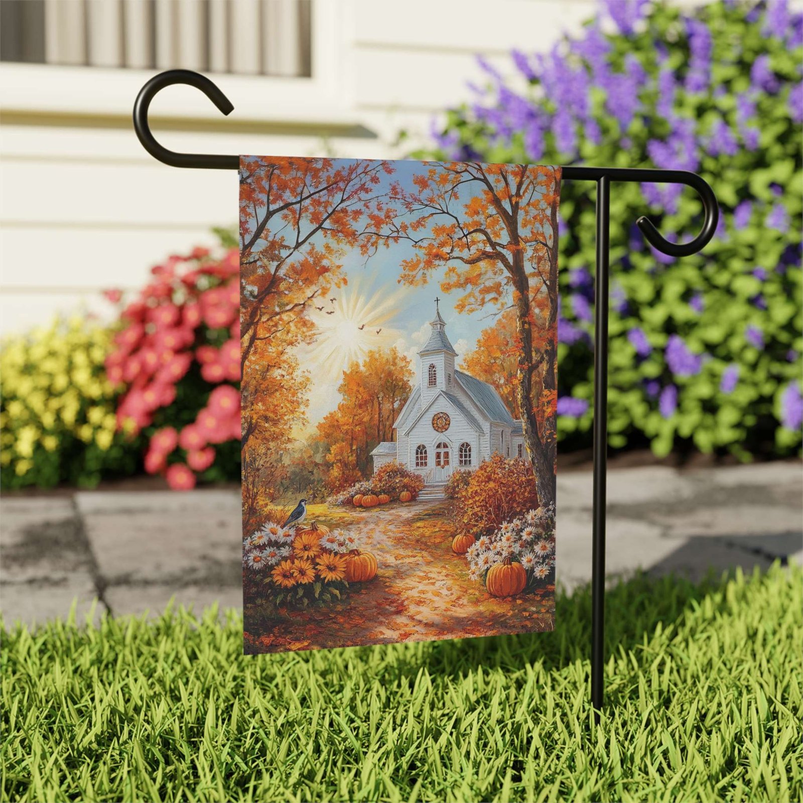 Ready to invite this captivating autumn white church scene and a wave of vibrant seasonal beauty into your outdoor world?