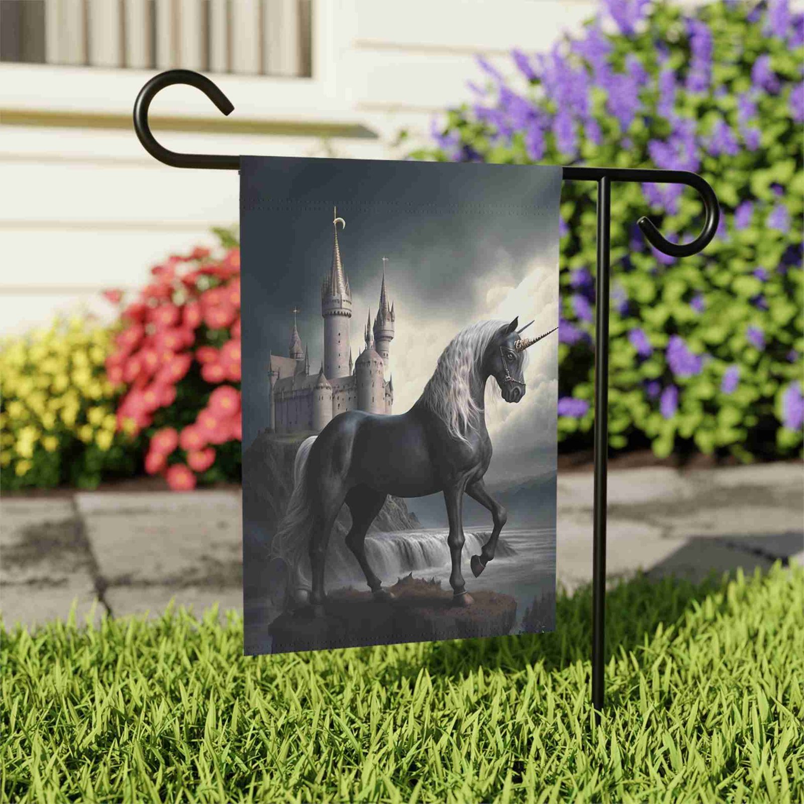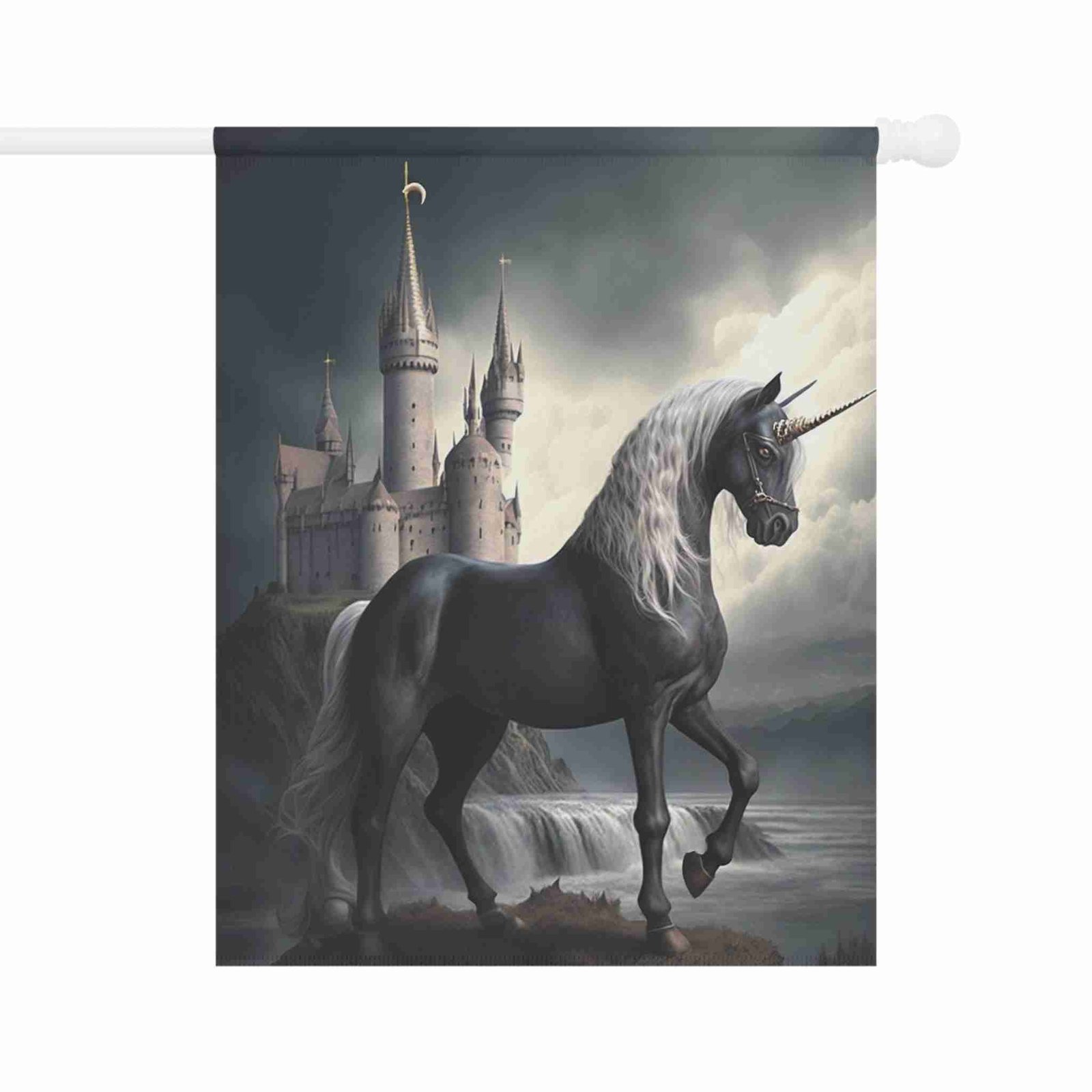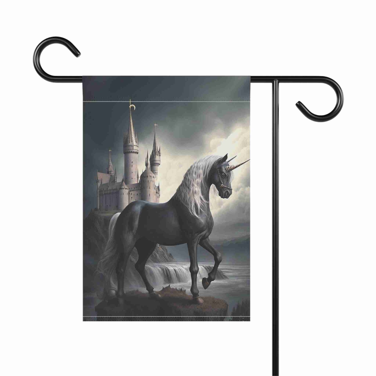 Unleash Enchanting Beauty with the Black Unicorn Garden Flag!
