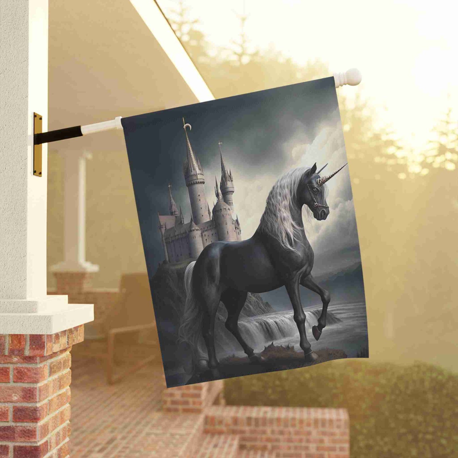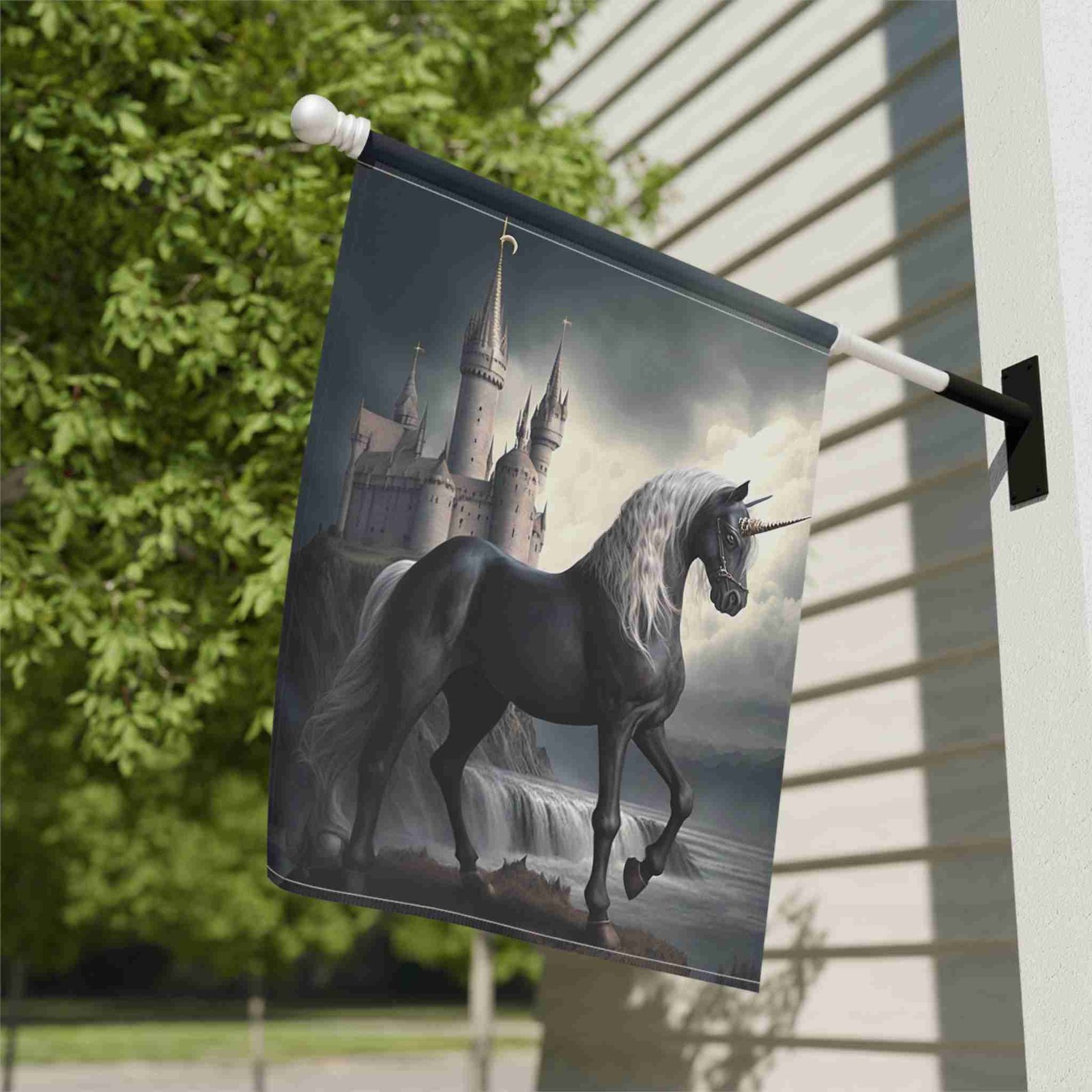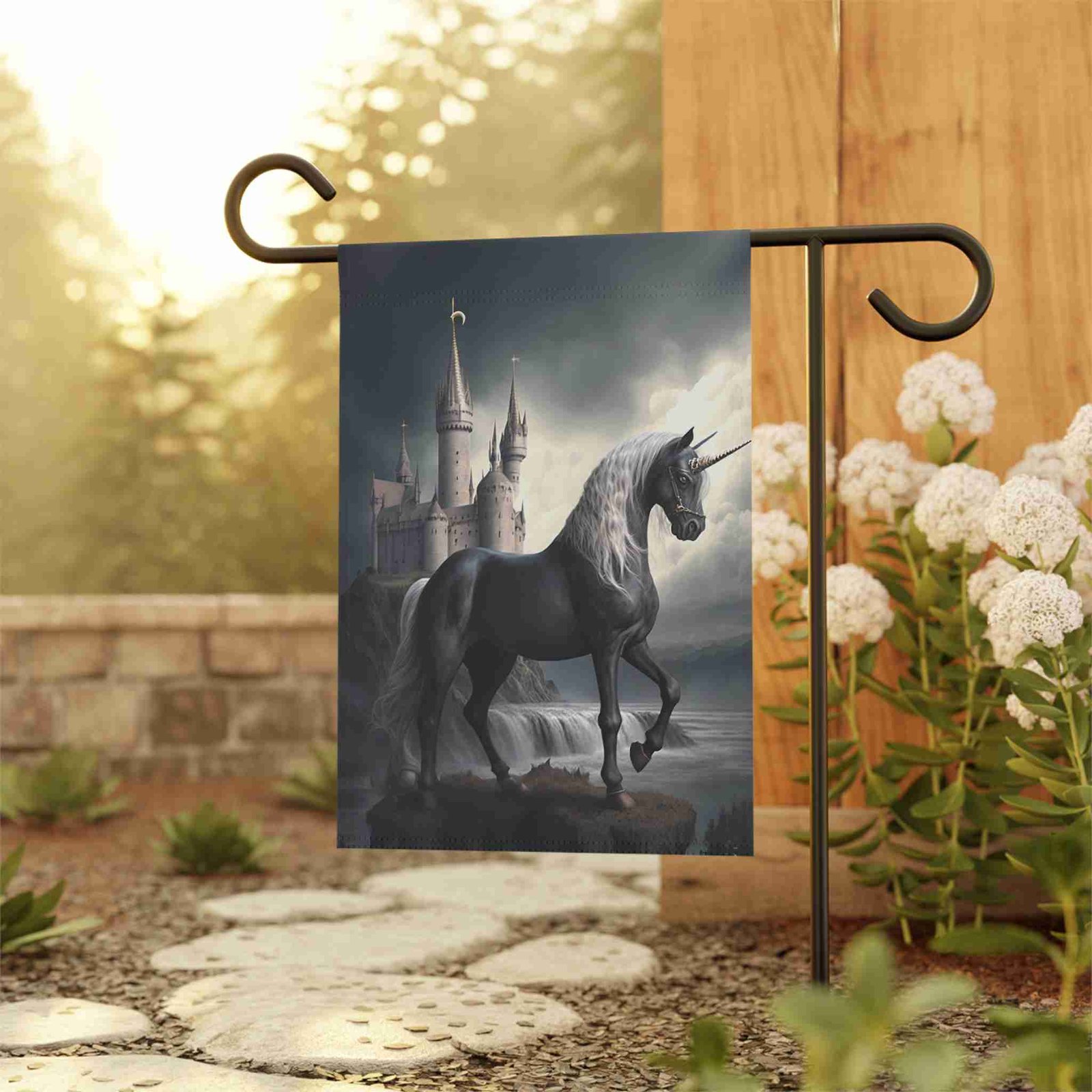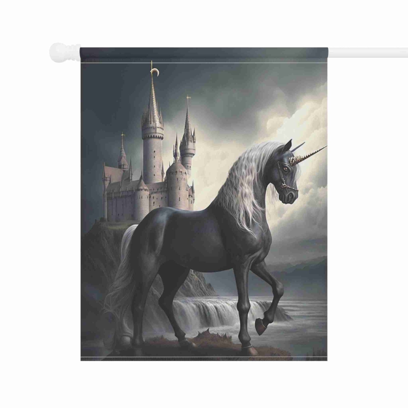 Unleash Enchanting Beauty with the Black Unicorn Garden Flag!