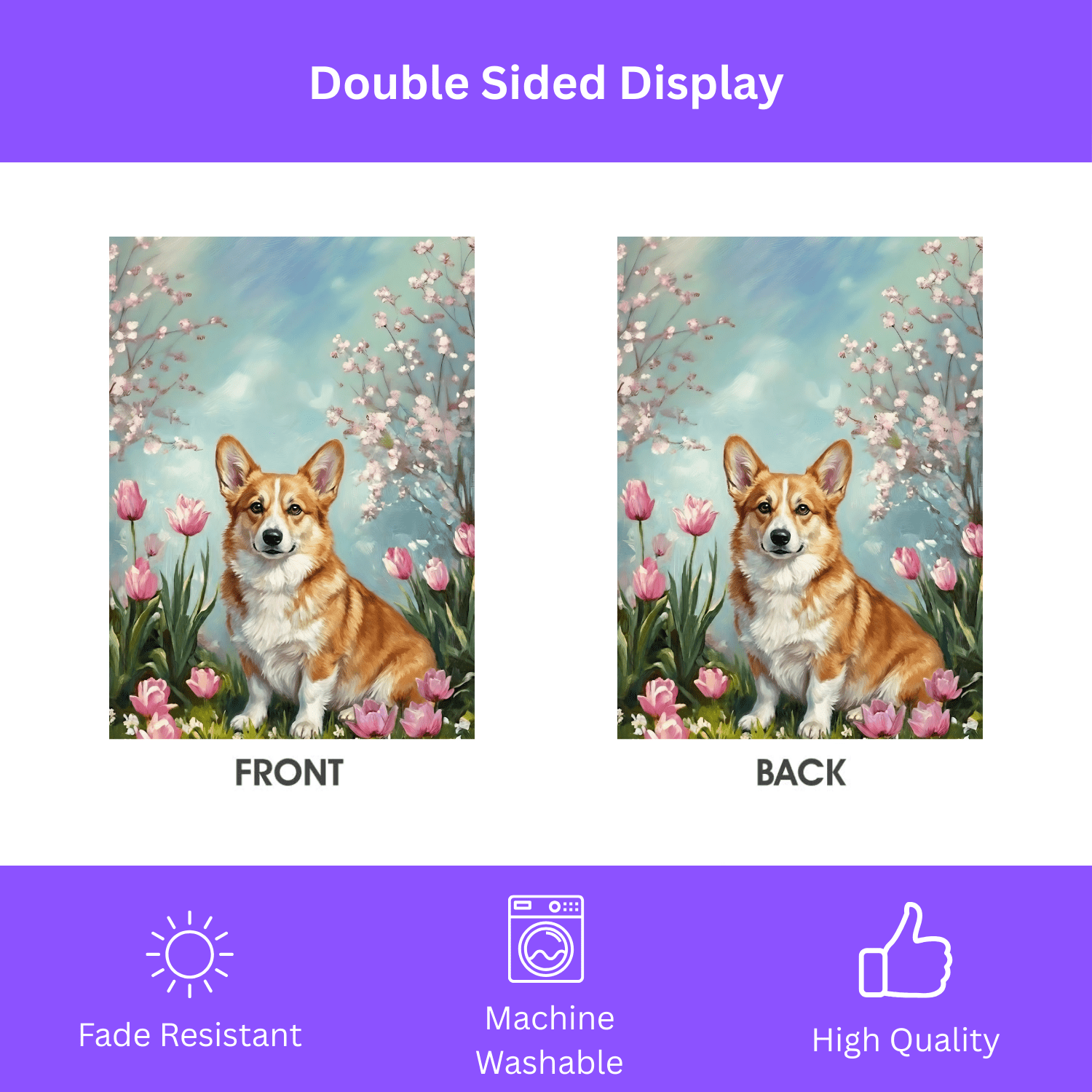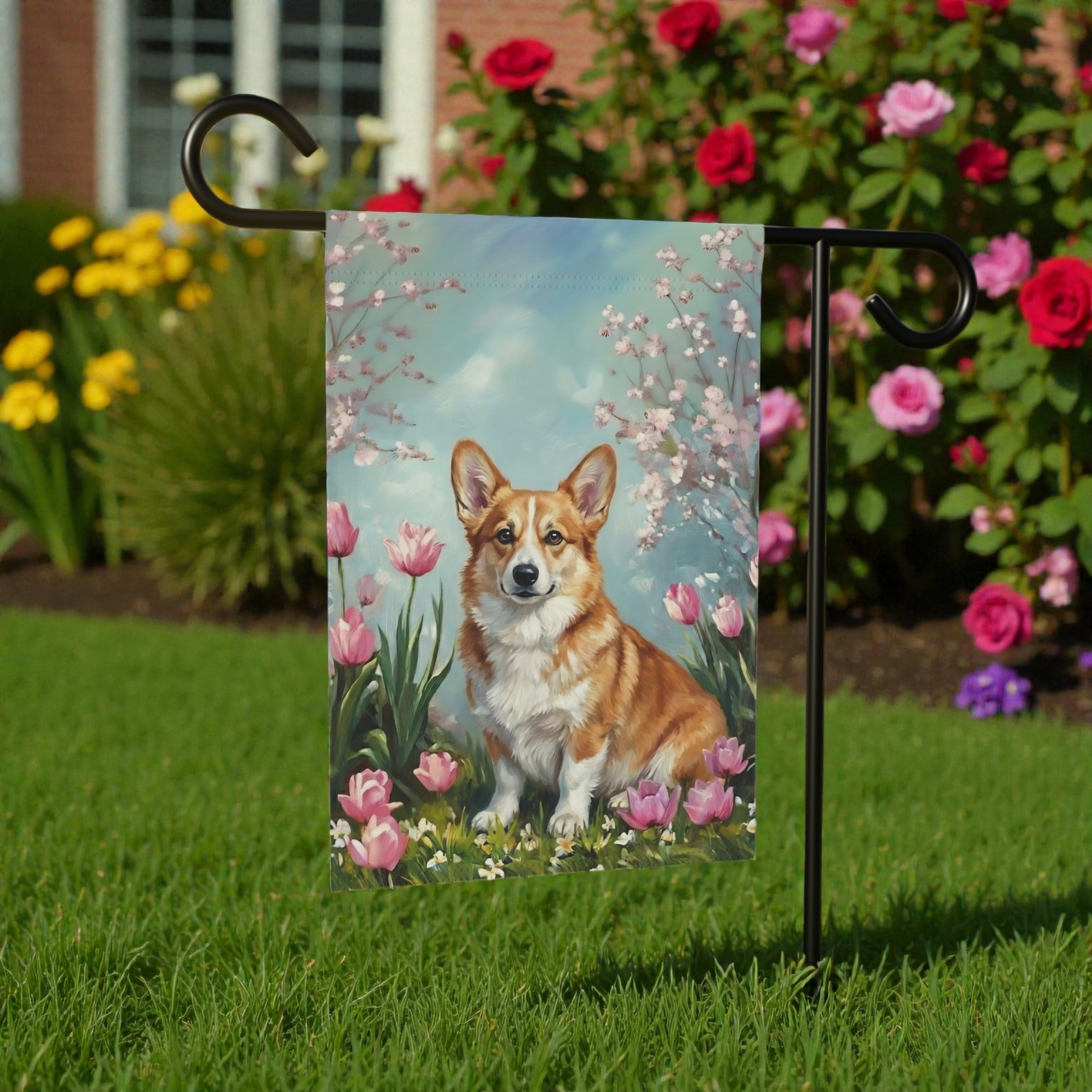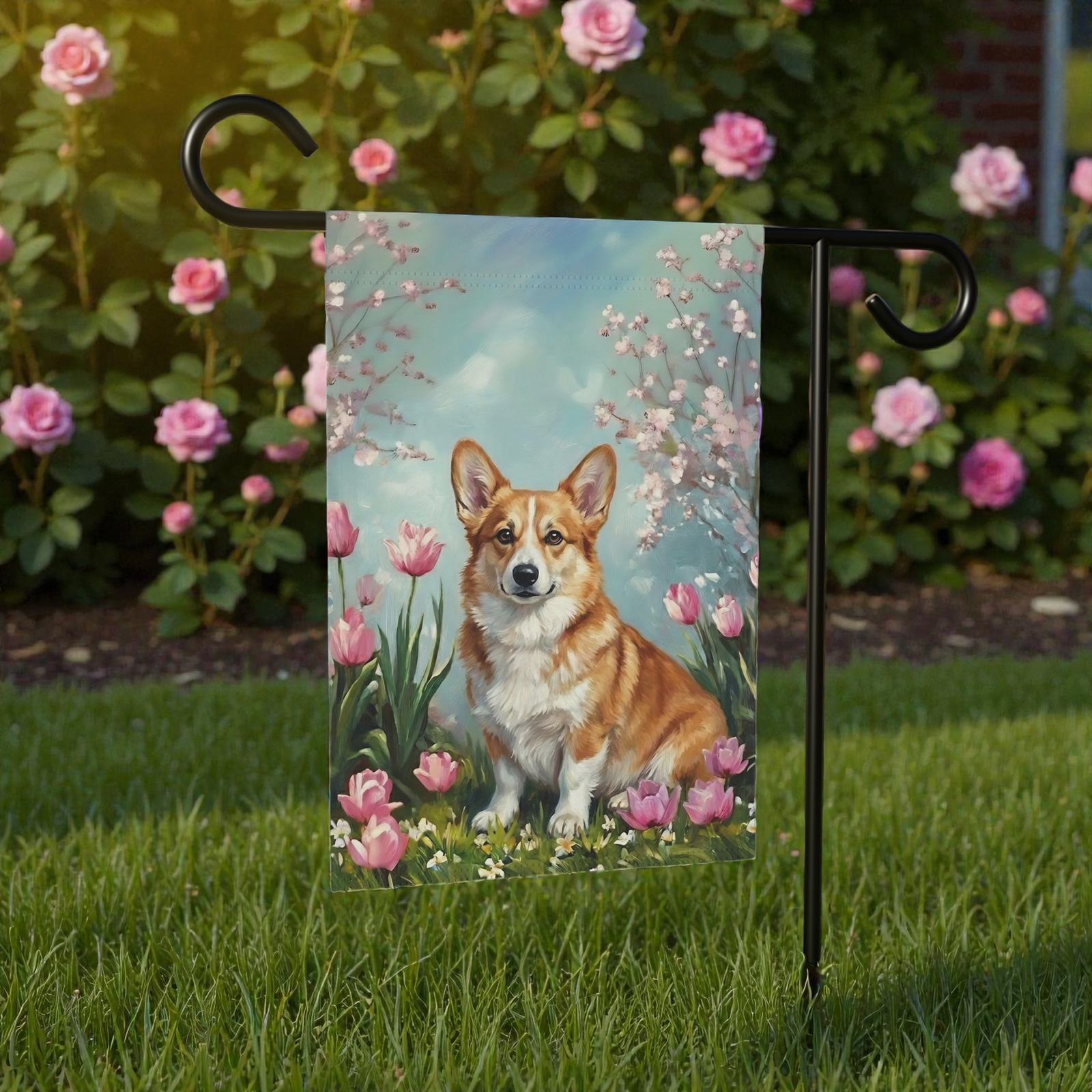 You’ve found it with the Corgi in the Tulips Spring Garden Flag. This isn’t just a banner; it’s a painterly escape. Imagine your guests walking up your path and seeing this: your noble, low-profile friend sitting peacefully among a sea of vibrant pink tulips and blossoming spring branches. With natural tones and elegant brushstrokes, this scene feels like a quiet morning walk captured on fabric—evoking a warm, cottage-garden mood that adds instant personality to any porch, entryway, or flower bed.