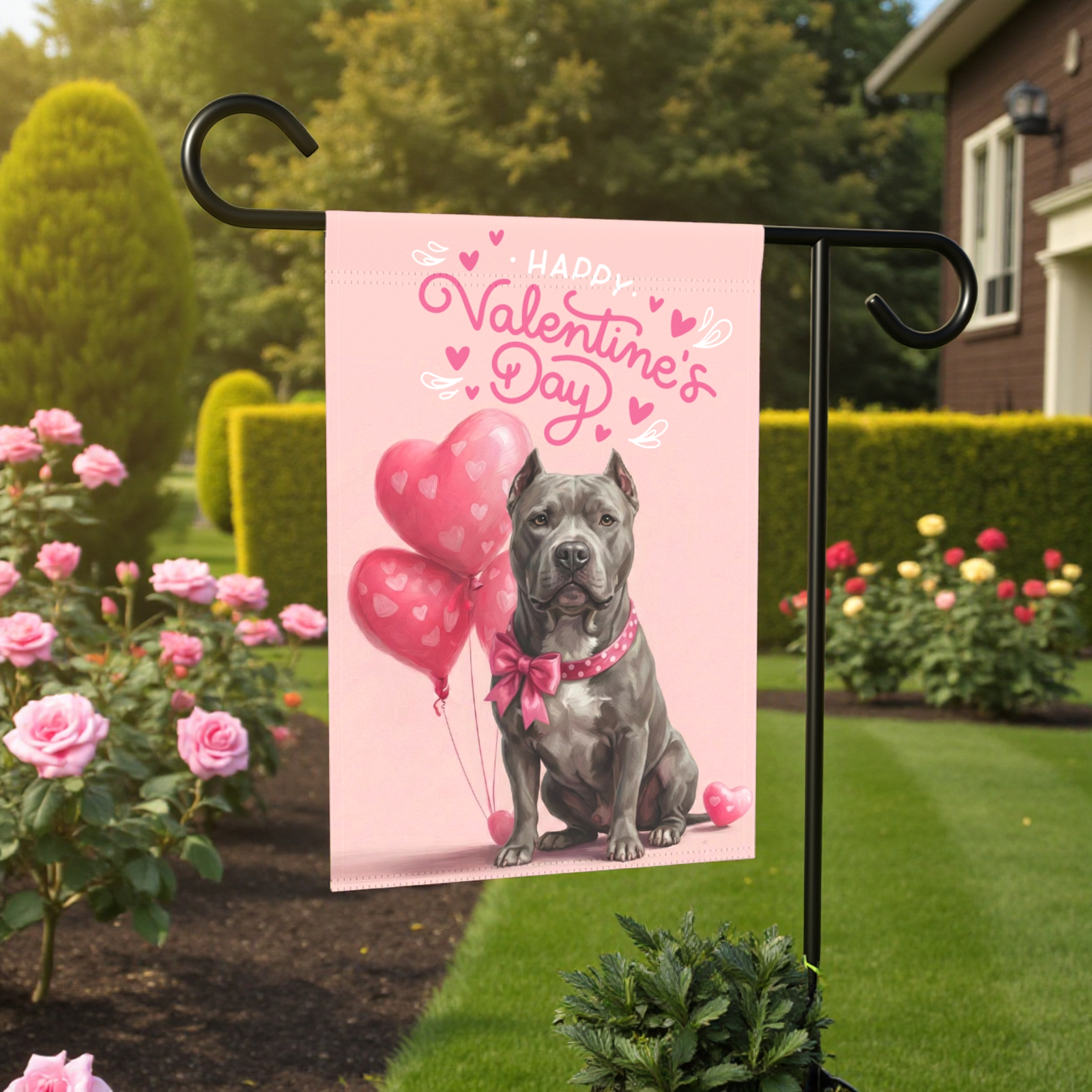 The Gray Pit Bull “Happy Valentine’s Day” Garden Flag is a masterclass in cozy, whimsical charm. Imagine the smiles from neighbors as they see this: your dapper, charcoal-gray friend wearing a darling pink bow, sitting peacefully among a cluster of glossy, heart-shaped balloons. With its dreamy muted pink palette and elegant, hand-lettered script, it transforms your porch, walkway, or garden path into a sanctuary of warmth. It’s the ultimate way to show the world that in your house, the best Valentine is the one with a blocky head and a heart of gold.