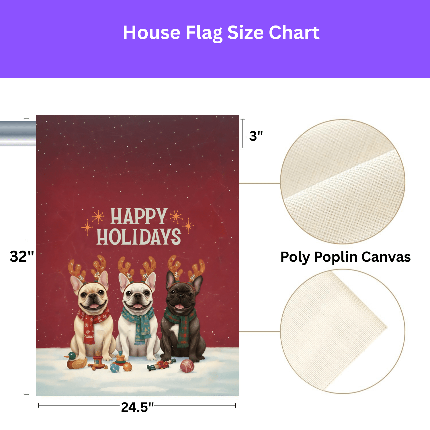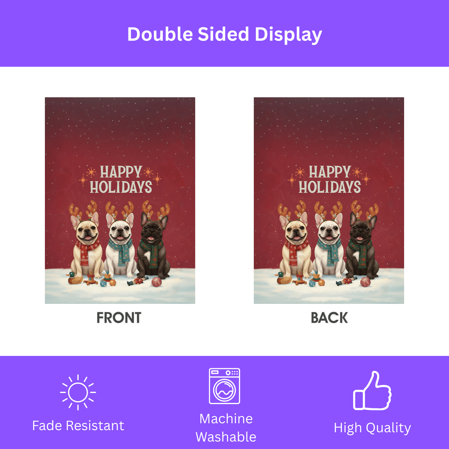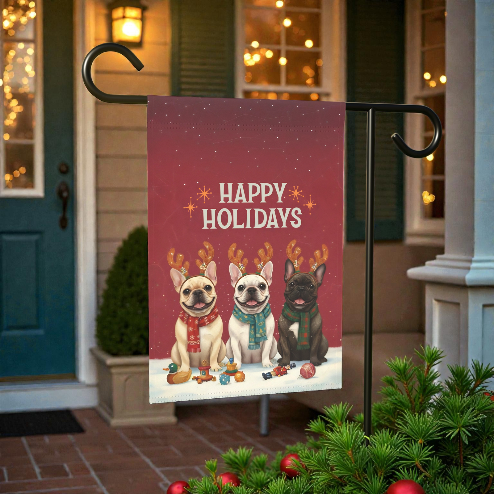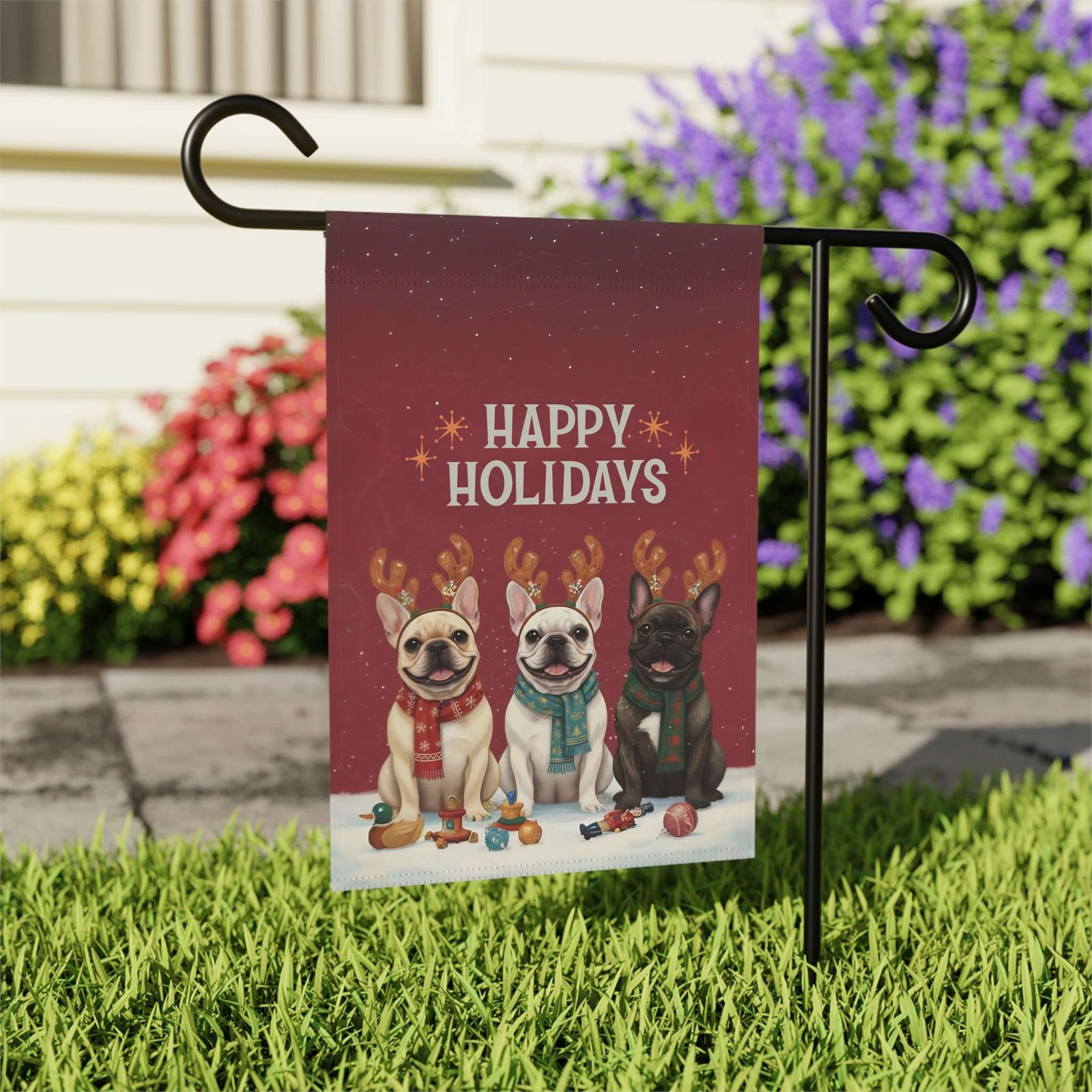 You’ve found it with the Happy Holidays French Bulldogs Garden Flag. This isn’t just a banner; it’s a dose of whimsical, heartwarming holiday cheer delivered right to your doorstep! Imagine your loved ones arriving and being greeted by this adorable scene: three charming Frenchies, decked out in antler headbands and knitted scarves, sitting patiently in the snow beneath a warm, inviting “Happy Holidays” greeting. The deep red background and vintage tones make it feel like a cherished, nostalgic holiday postcard.