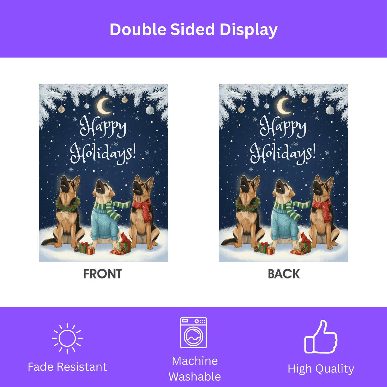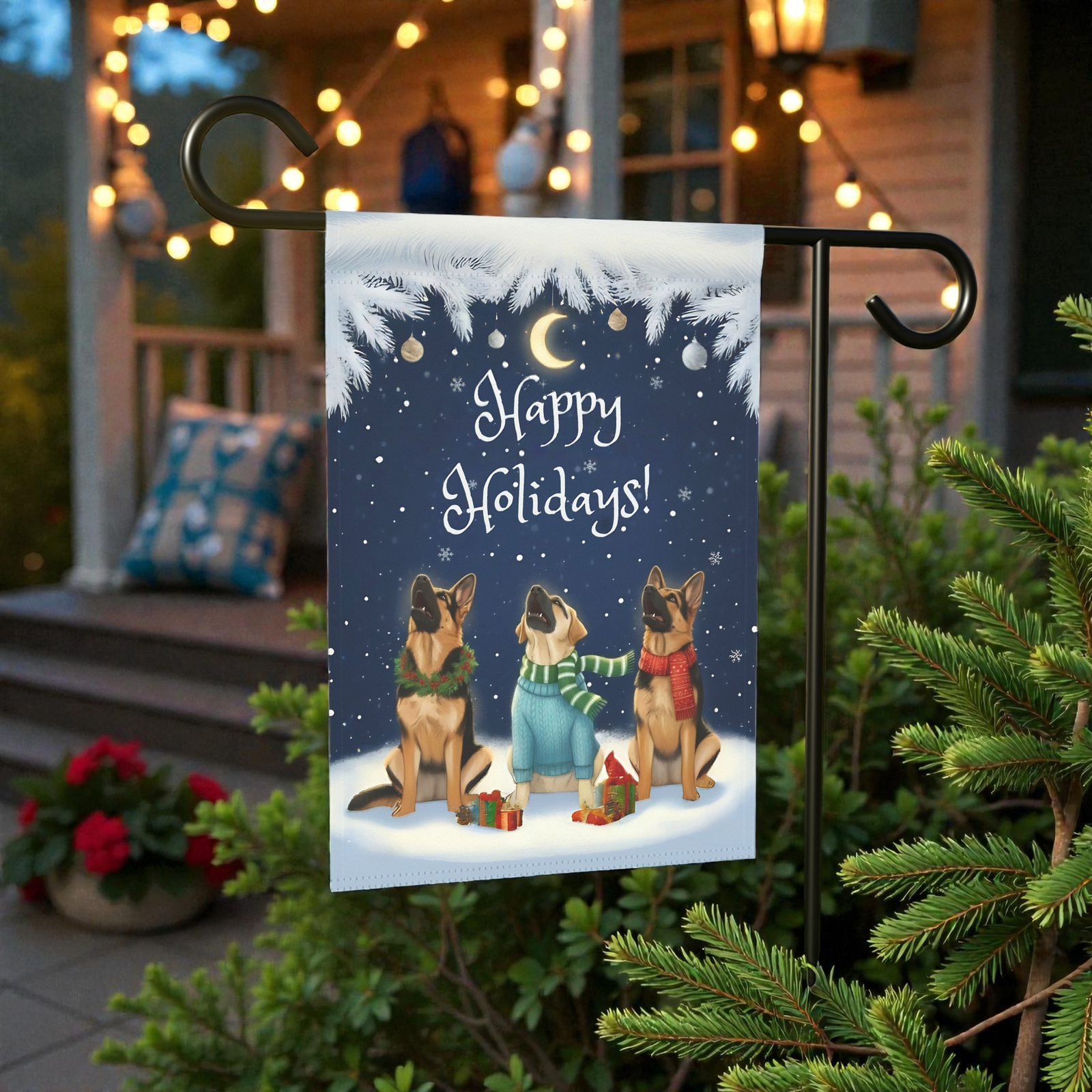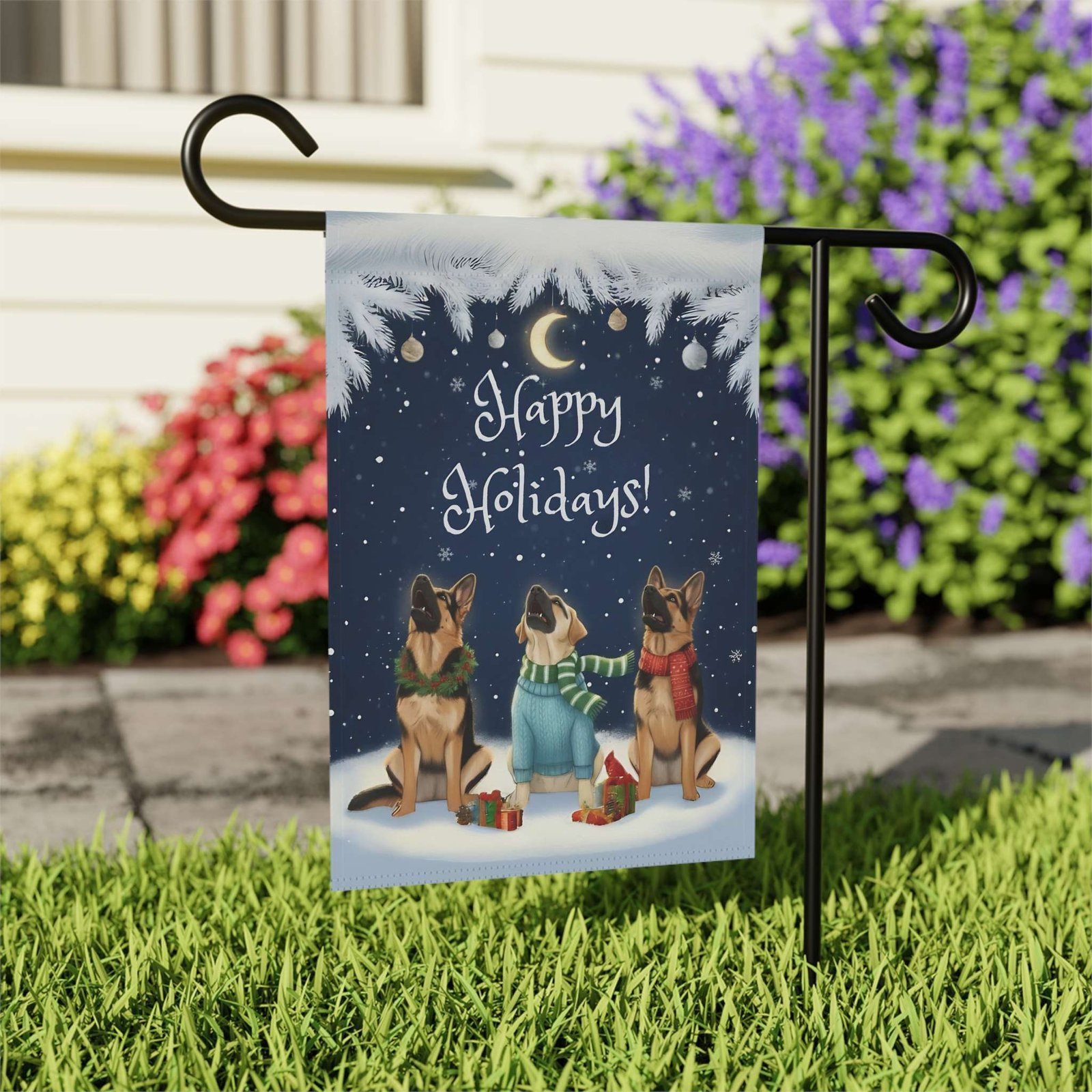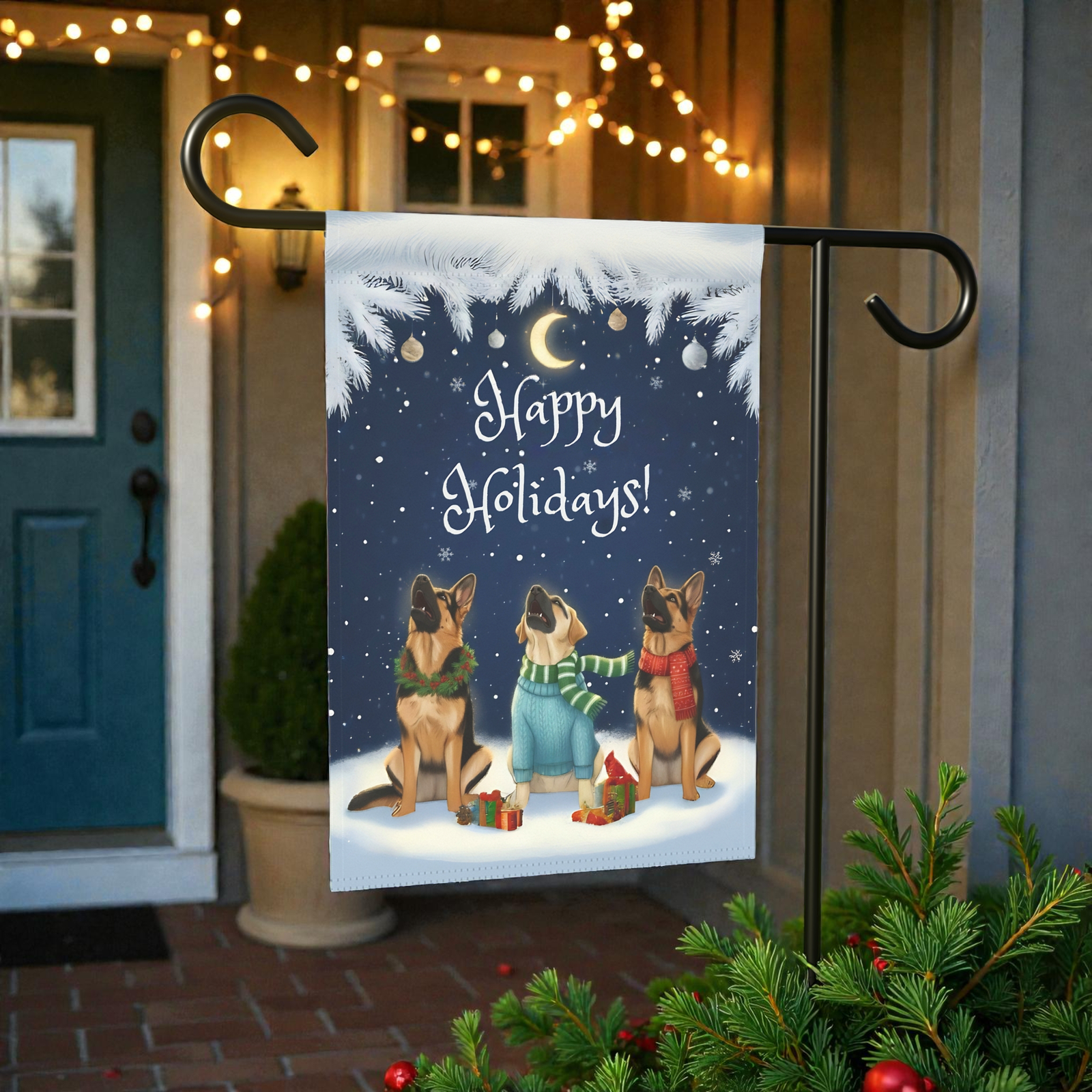 You’ve found it with the Happy Holidays German Shepherds Garden Flag. This isn’t just a banner; it’s a breathtaking, heartwarming scene! Imagine your loved ones arriving and being greeted by this peaceful winter tableau: three attentive German Shepherds, sitting patiently in the soft snow beneath a shimmering crescent moon and twinkling lights, with scarves fluttering gently and tiny gifts nestled at their paws. The deep navy sky and delicate pine bough frame evoke a quiet, magical holiday night—the perfect expression of seasonal tranquility.