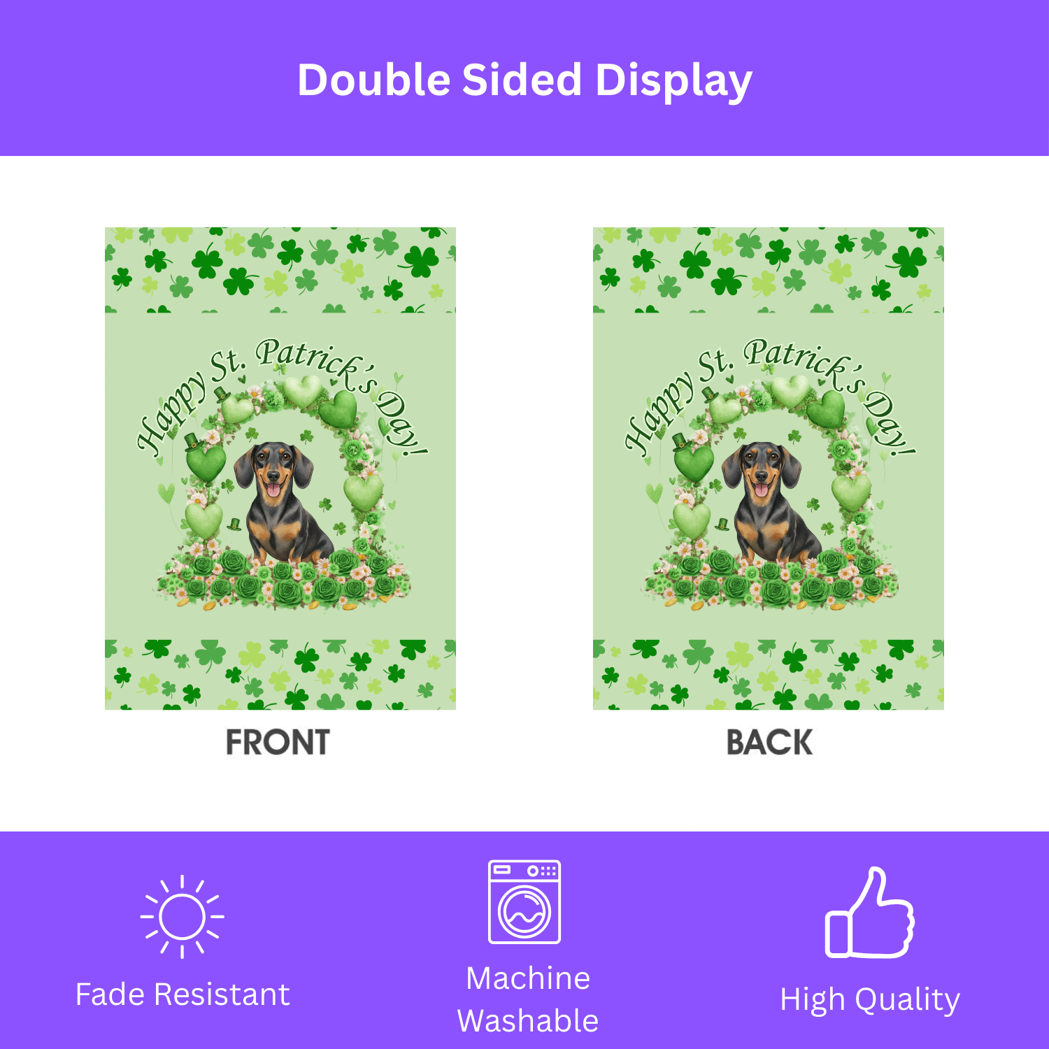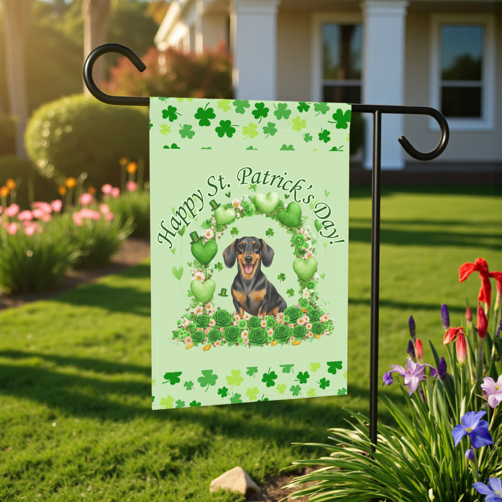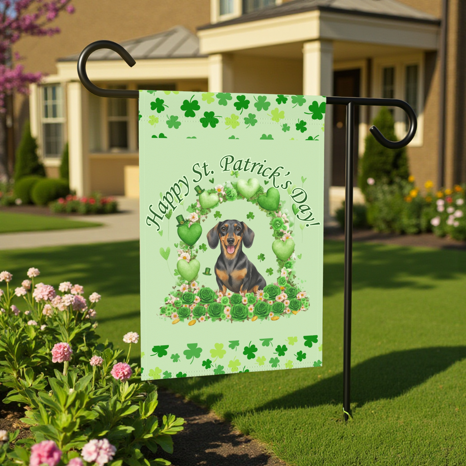 The Happy St. Patrick’s Day Arch Dachshund Flag is a masterpiece of cozy, festive whimsy. Imagine your porch transformed by this: a dapper, soulful Doxie portrait nestled within a lush archway of emerald shamrocks, set against a soothing mint-green backdrop. With scattered four-leaf motifs and a playful “hand-painted” feel, it turns your garden bed, patio, or entryway into a joyful sanctuary. It’s the ultimate way to show the neighborhood that in your house, the “Luck of the Irish” comes in a long, lovable package.