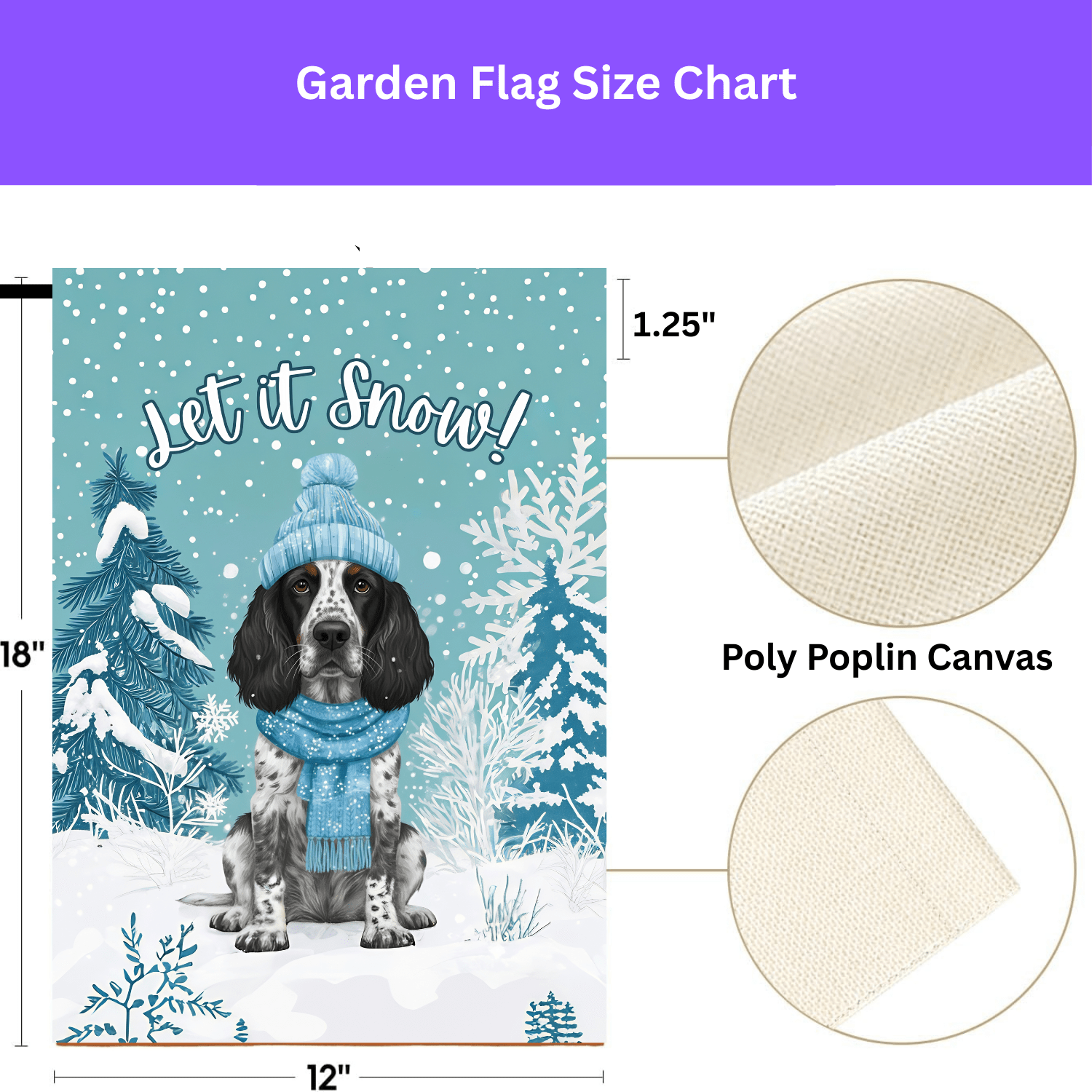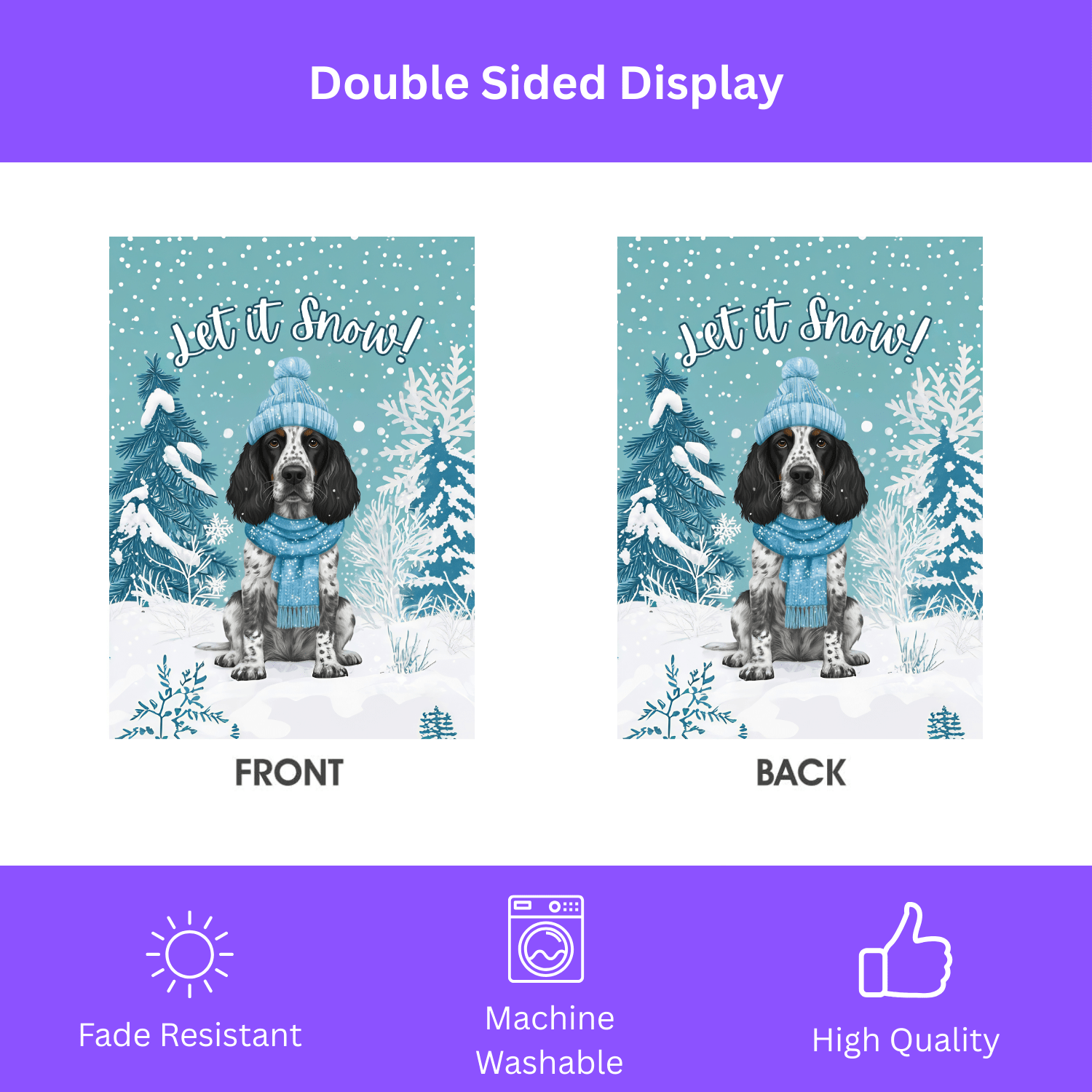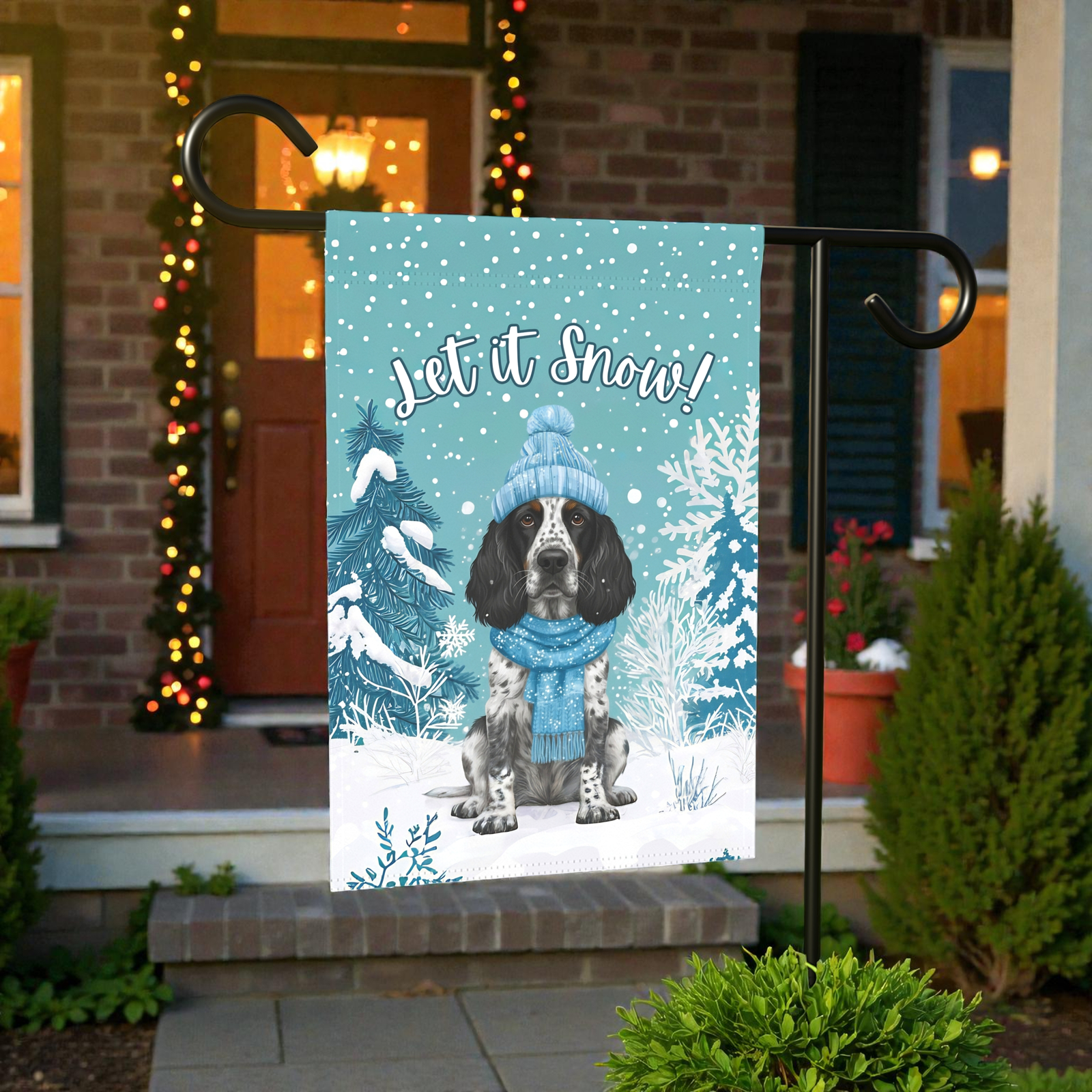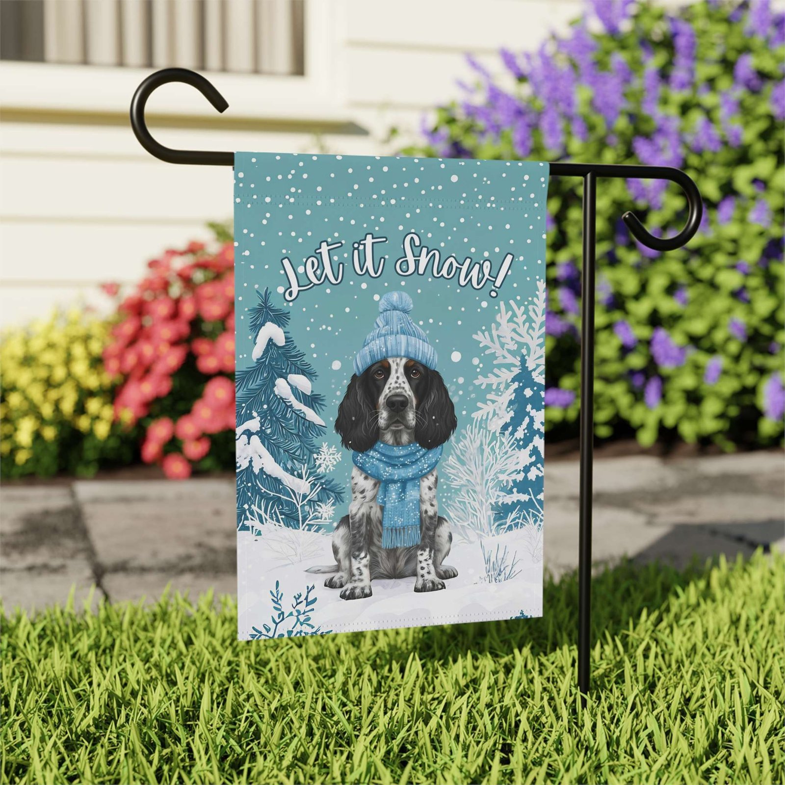 You’ve found it in the “Let It Snow” Blue Picardy Spaniel Garden Flag. This isn’t just a banner; it’s an instant dose of seasonal cheer! Imagine this: your sweet Spaniel, playfully bundled in a knit hat and scarf, surrounded by frosted pine silhouettes and gentle snowfall, with the whimsical greeting “Let it Snow!” arching overhead. It’s a touching scene that brings a sense of playful magic and canine charm to your porch or garden for Christmas, New Year’s, and beyond.