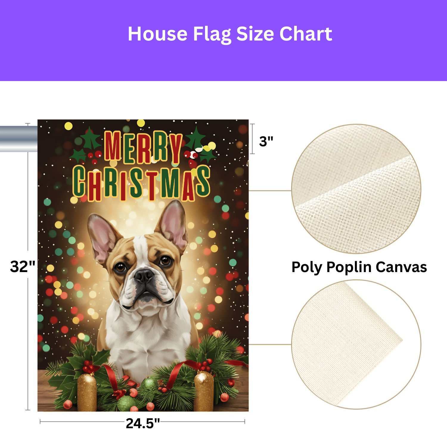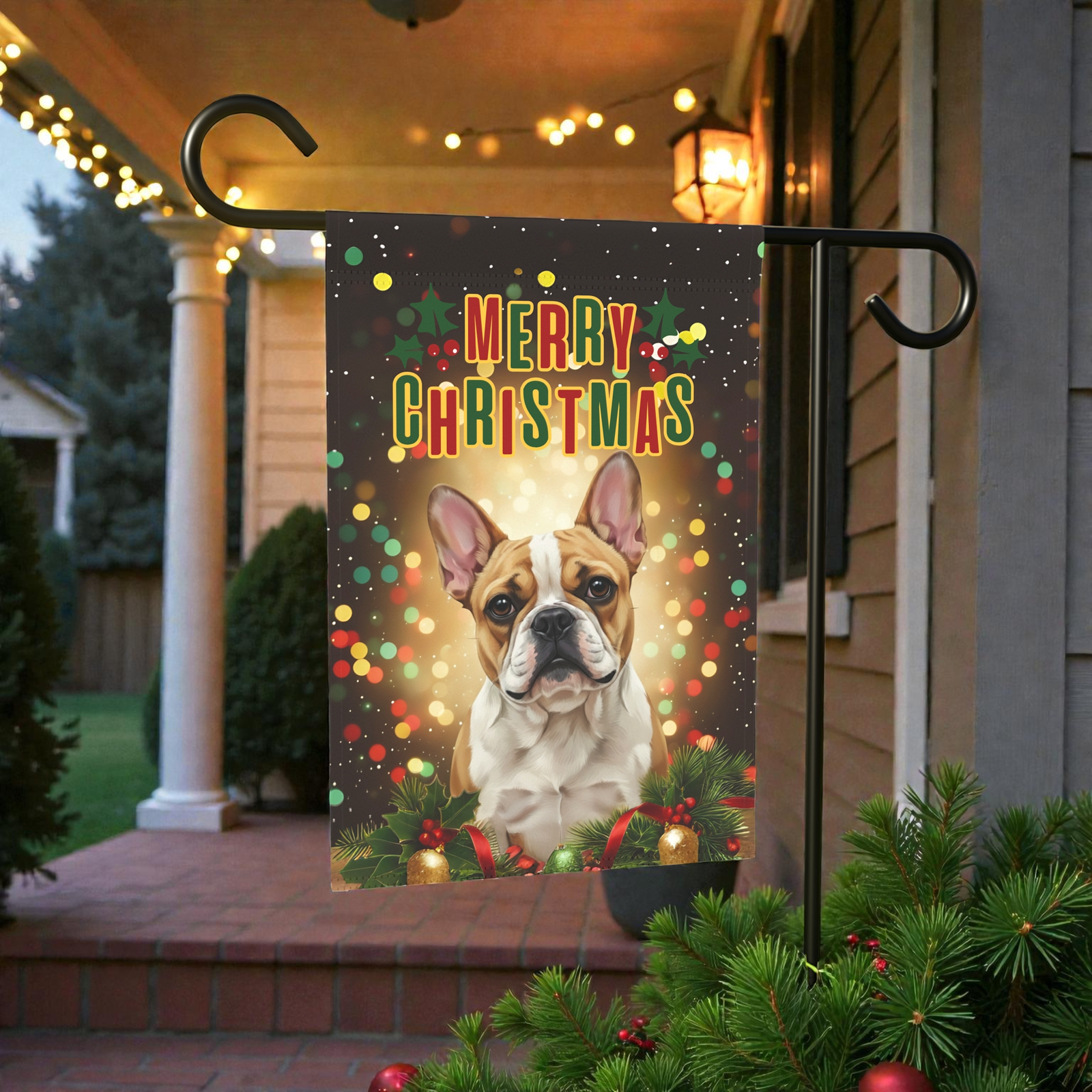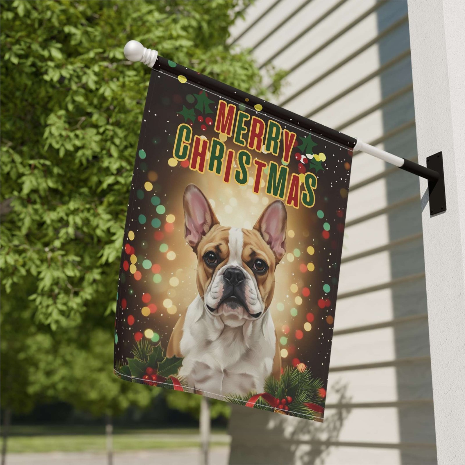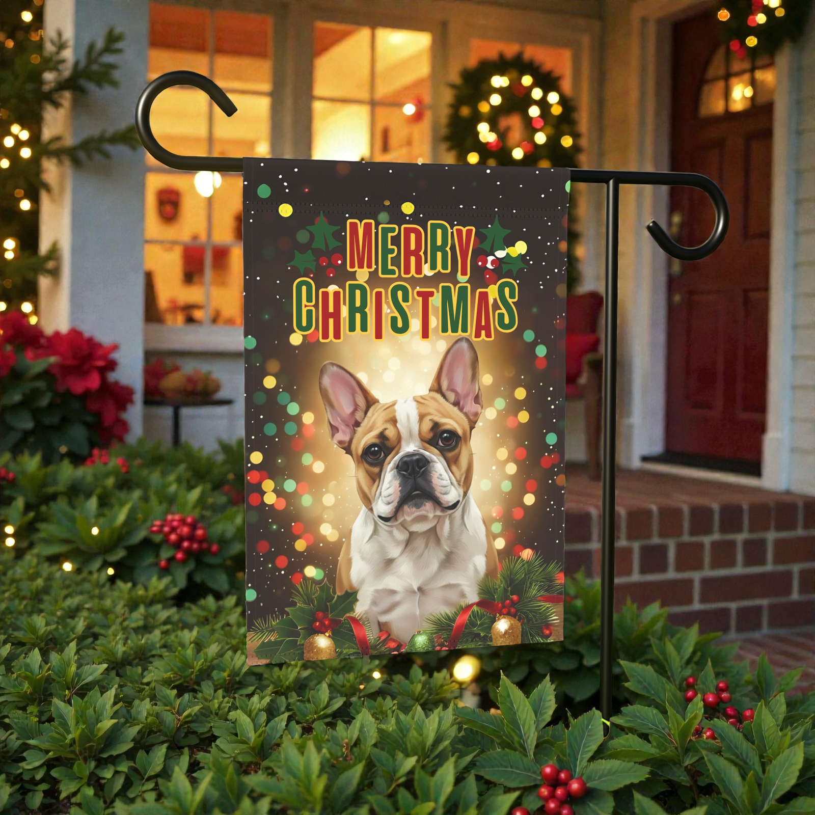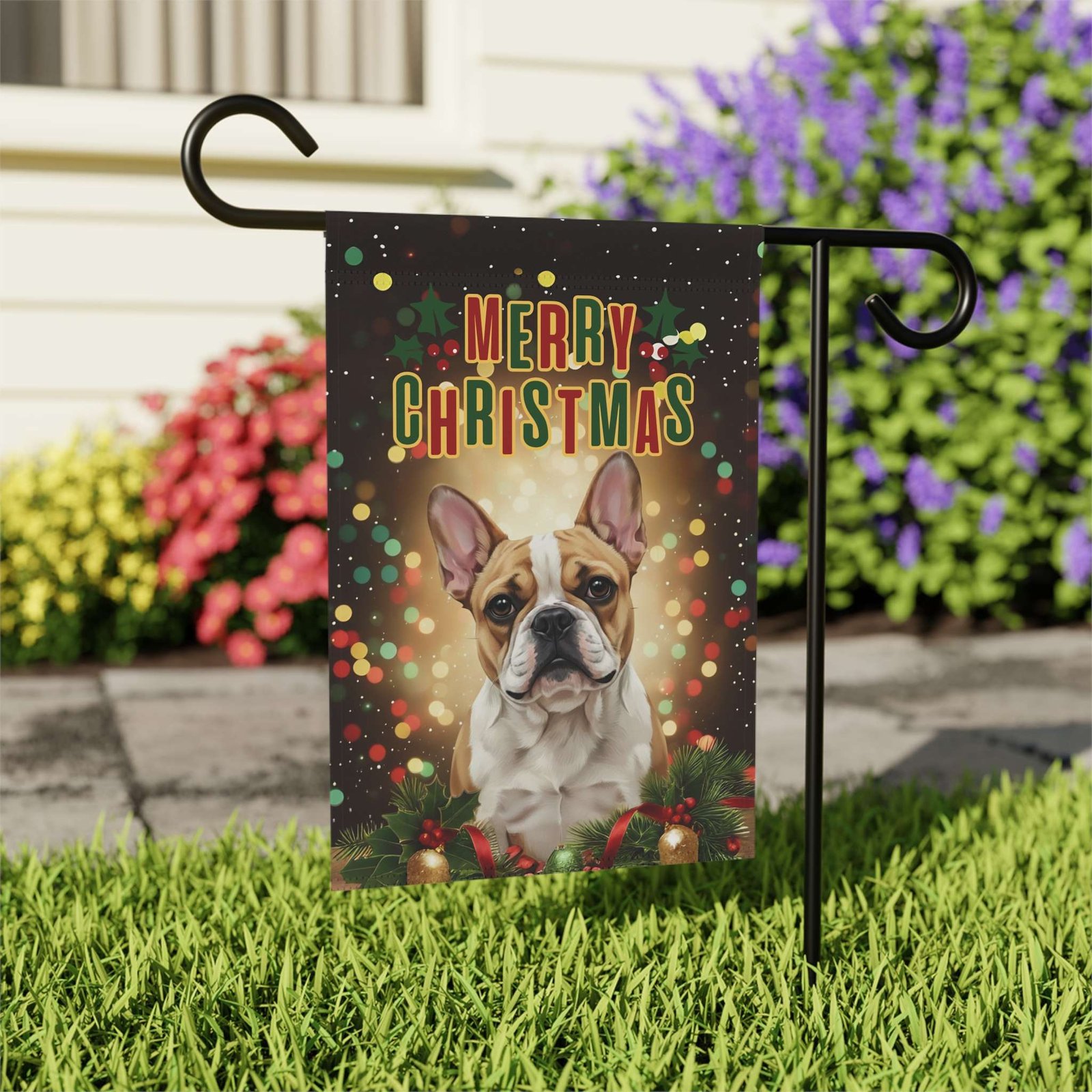 You’ve found it with the Merry Christmas in Lights French Bulldog Garden Flag. This isn’t just a banner; it’s a breathtaking, heartwarming scene! Imagine your loved ones arriving and being greeted by this beautiful, vibrant tableau: your soulful French Bulldog, framed by lush festive greenery and softly glowing lights, with a vintage-inspired “Merry Christmas” greeting arching above. It perfectly captures that feeling of coming home to a cozy, brightly lit welcome on a cold winter night.