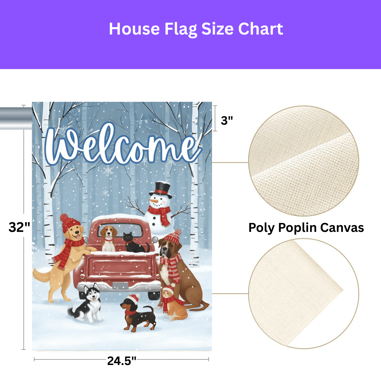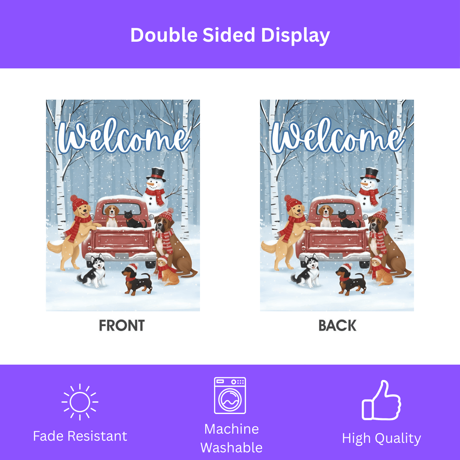 You’ve found it with the Pet Winter Welcome Garden Flag. This flag isn’t just a banner; it’s a nostalgic dose of seasonal joy! Imagine this: a vintage red truck, snowy and bright, parked peacefully among white birch trees, with a friendly snowman standing guard. But the best part? A playful group of happy dogs are gathered in the snow beneath a warm, inviting “Welcome” greeting. This scene perfectly blends rustic, classic winter charm with your undeniable love for pets.