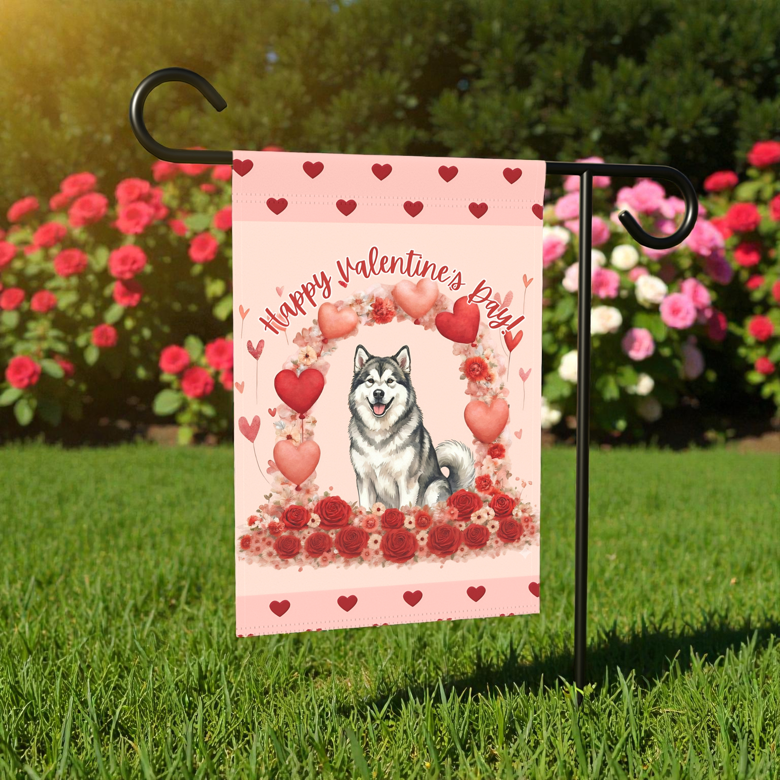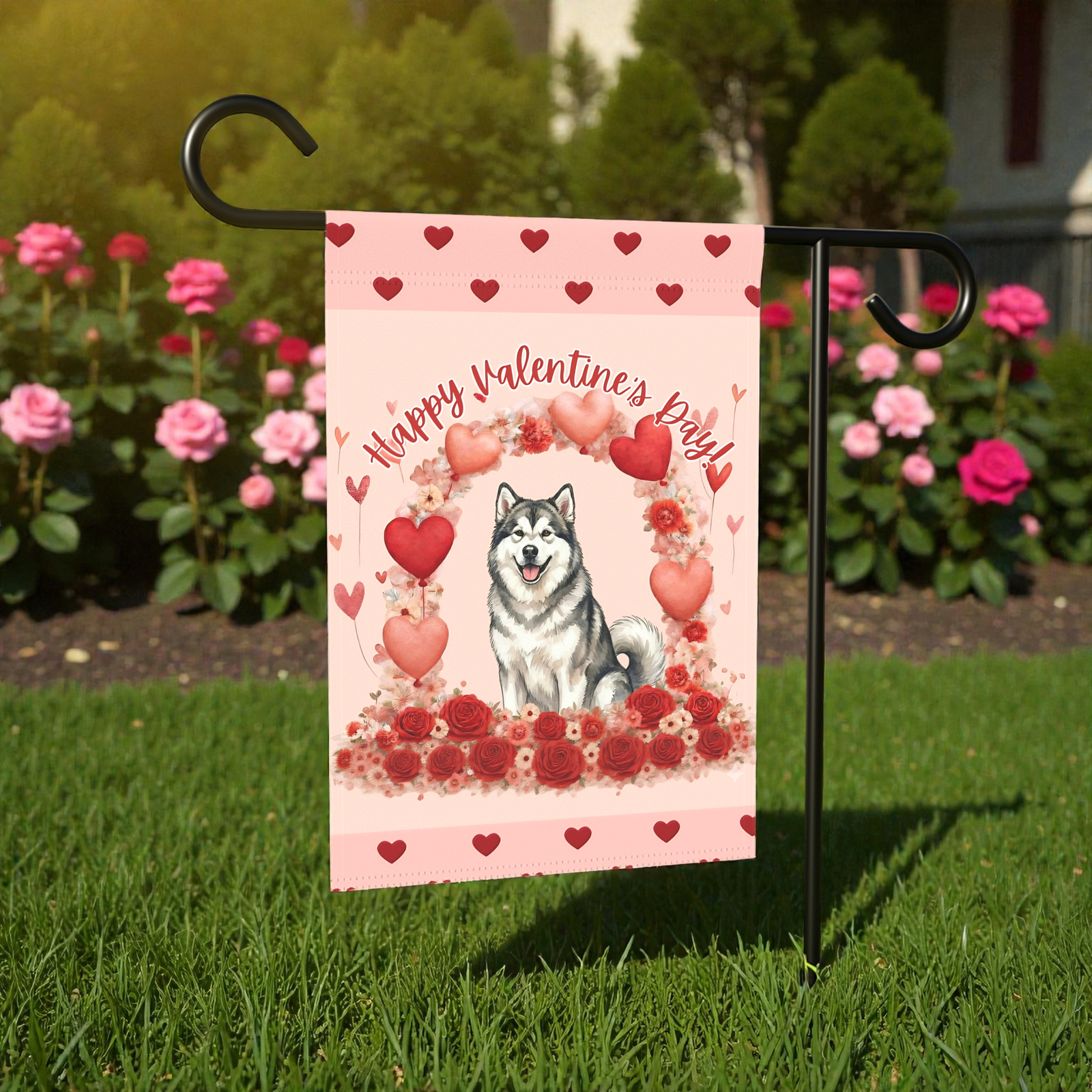You’ve found it with the Valentine’s Day Alaskan Malamute Garden Flag. This isn’t just a banner; it’s a playful love letter to your neighbors and guests. Imagine your friends arriving to see this: your noble, woolly friend sitting proudly atop a lush bed of roses, surrounded by a whimsical shower of hearts. With its dreamy blush tones and the adorable, hand-lettered “Happy Valentine’s Paw!” script, it transforms your porch, walkway, or garden bed into a cozy sanctuary of “Puppy Love.”
