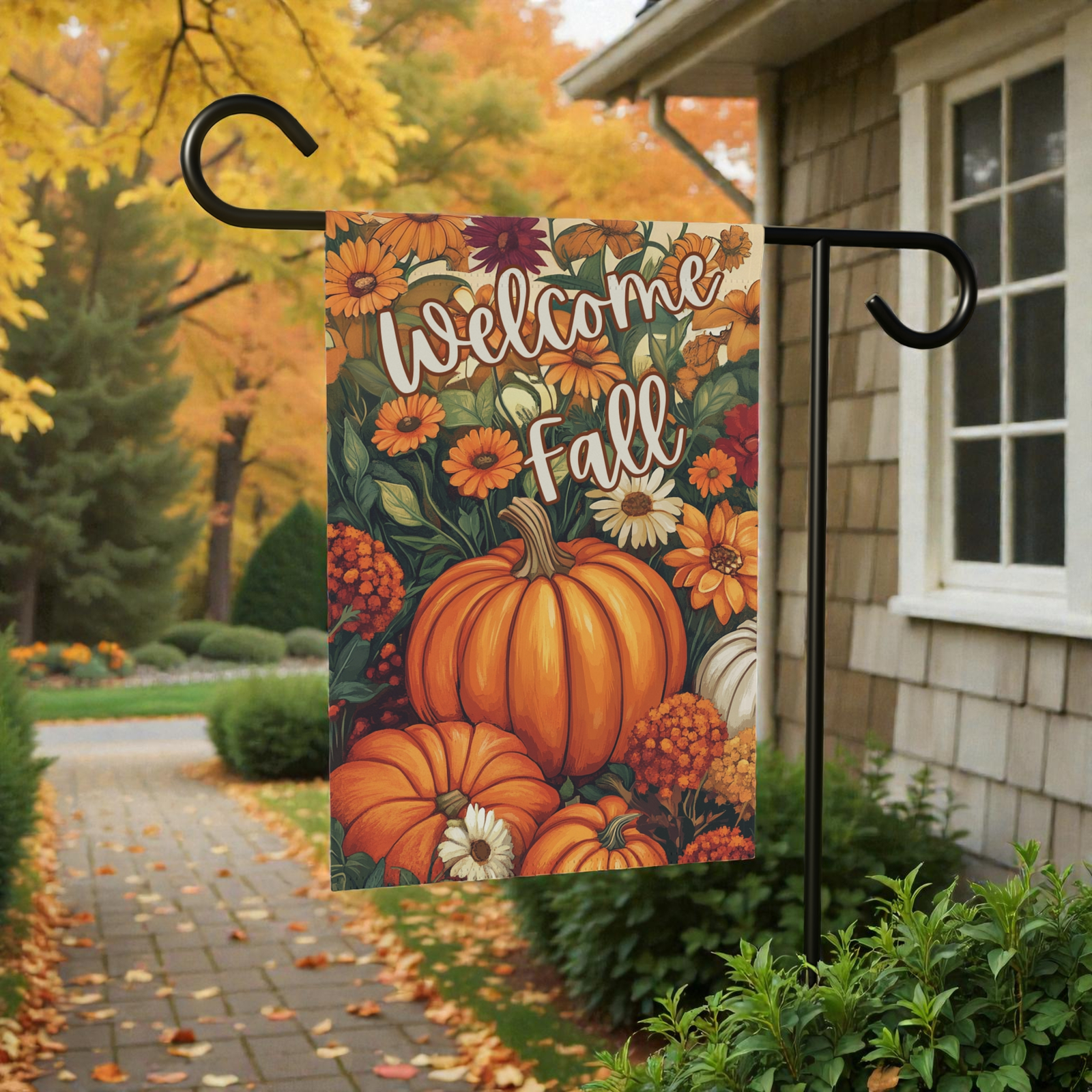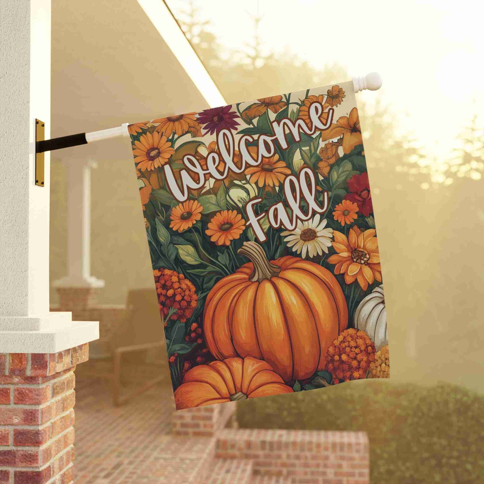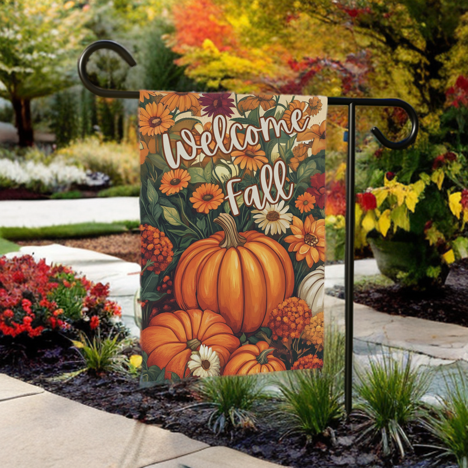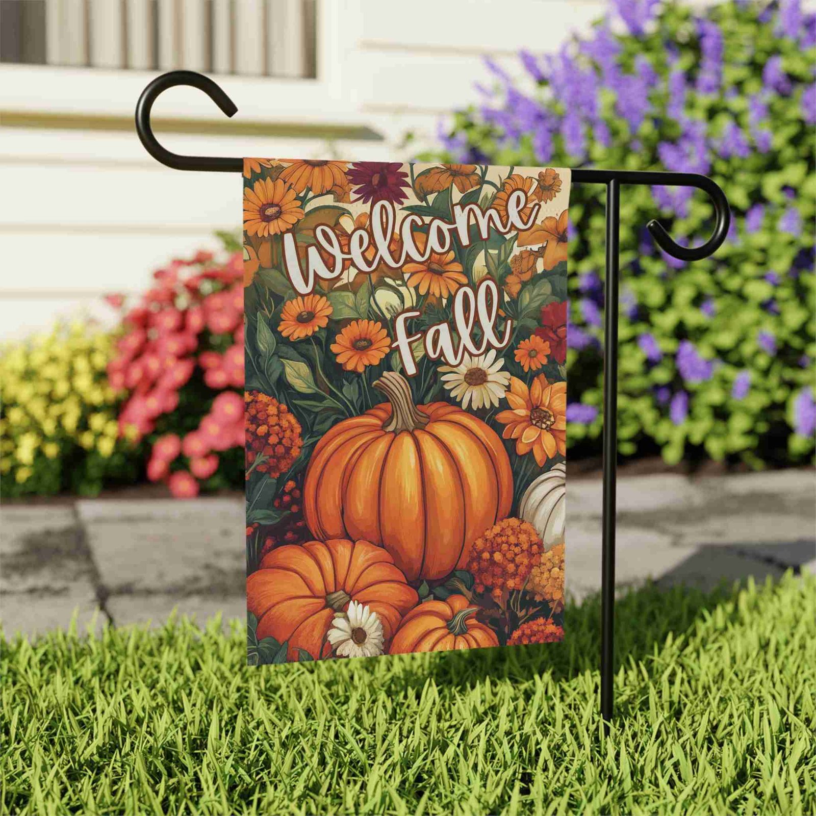 Enhance your outdoor space with a spectacular burst of fall festivity! This isn’t just a charming garden banner; it’s a vibrant invitation to embrace the warmth and spirit of autumn. Imagine a beautiful backdrop of bright pumpkins and cheerful flowers, all brought to life with colors so vivid they practically glow, transforming your garden or patio into a welcoming, seasonal masterpiece.