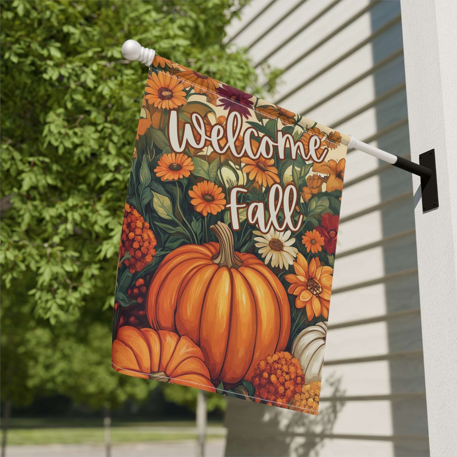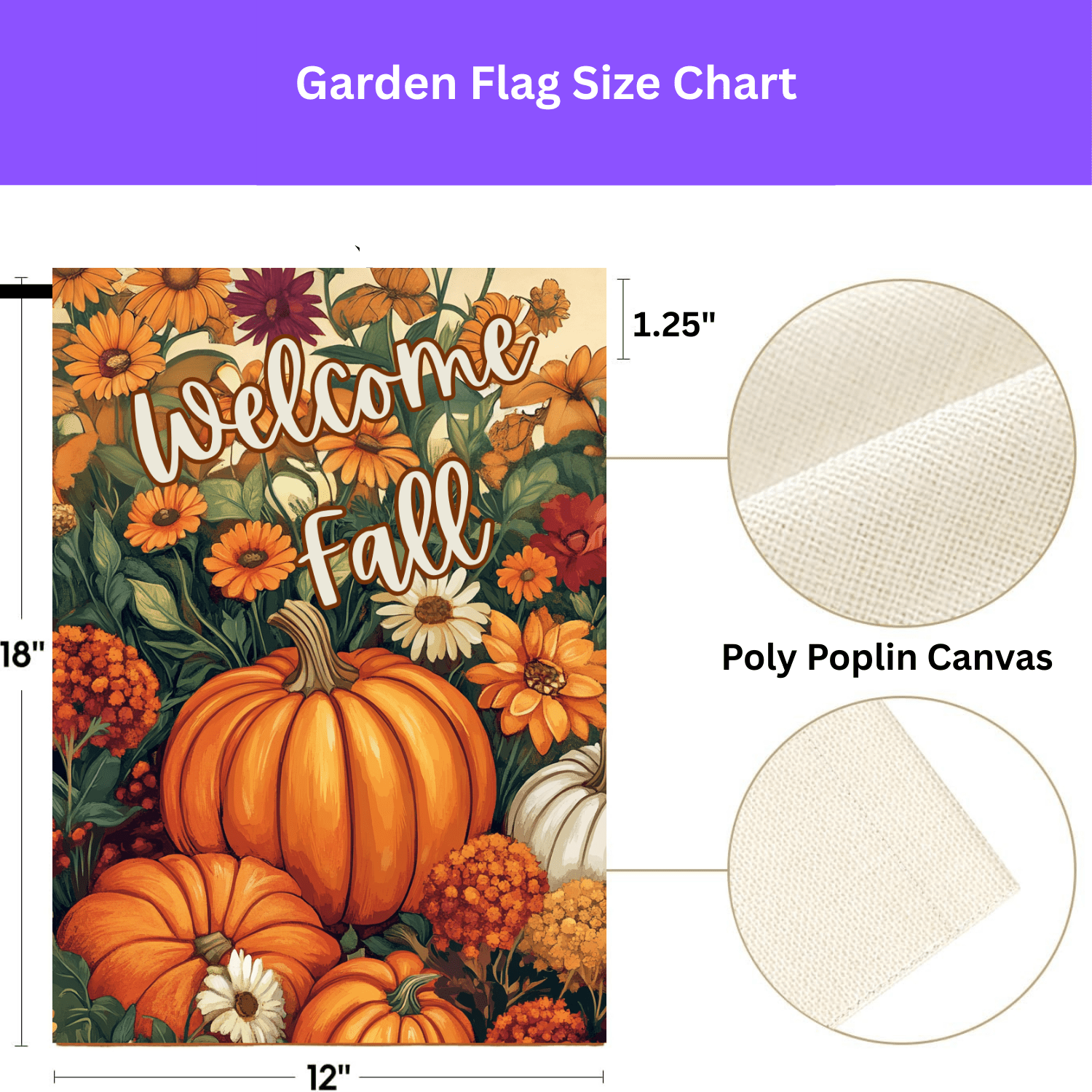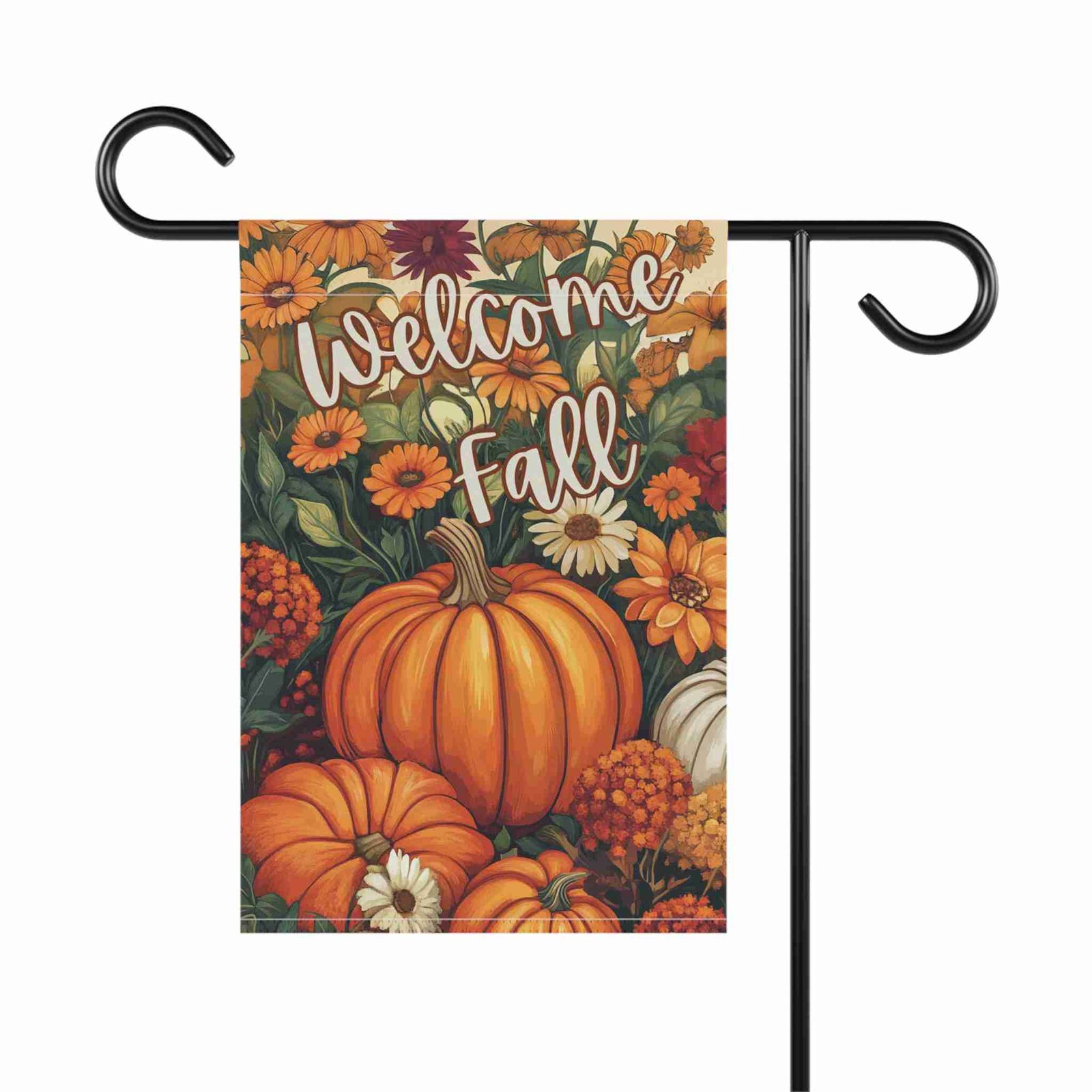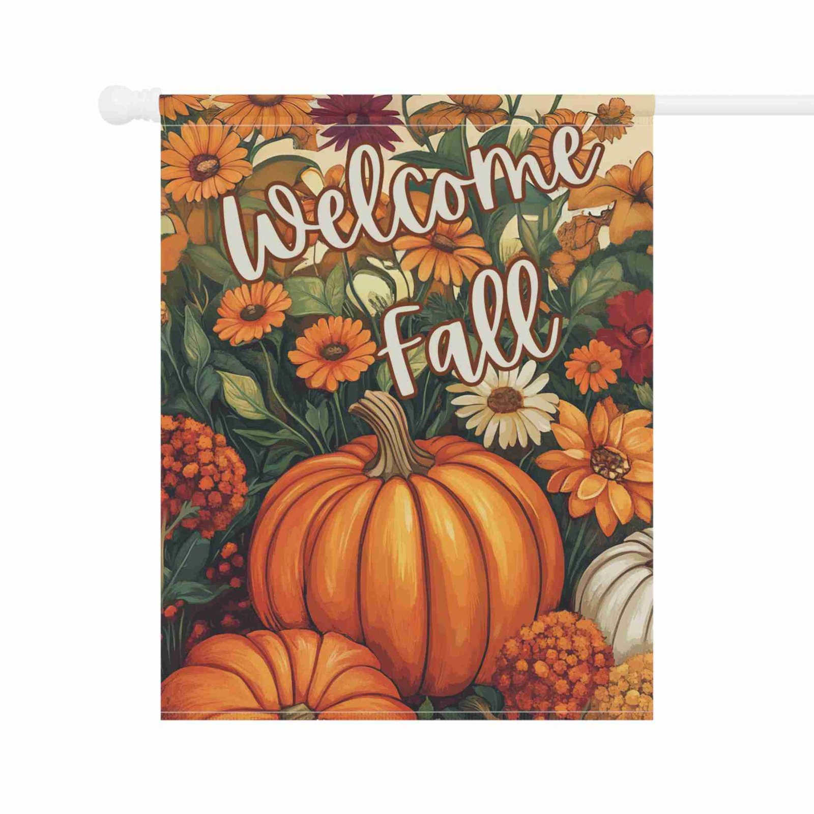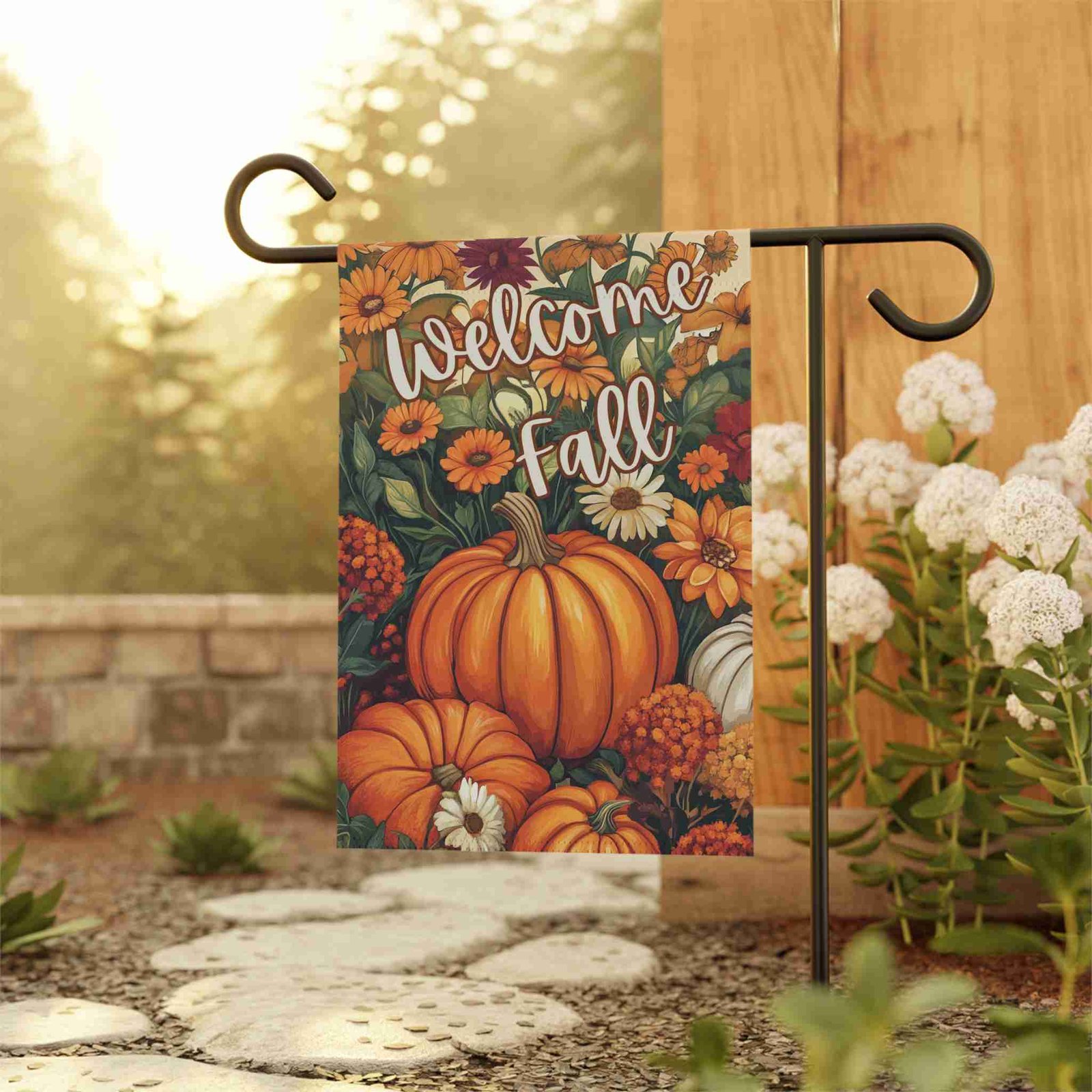 Enhance your outdoor space with a spectacular burst of fall festivity! This isn’t just a charming garden banner; it’s a vibrant invitation to embrace the warmth and spirit of autumn. Imagine a beautiful backdrop of bright pumpkins and cheerful flowers, all brought to life with colors so vivid they practically glow, transforming your garden or patio into a welcoming, seasonal masterpiece.