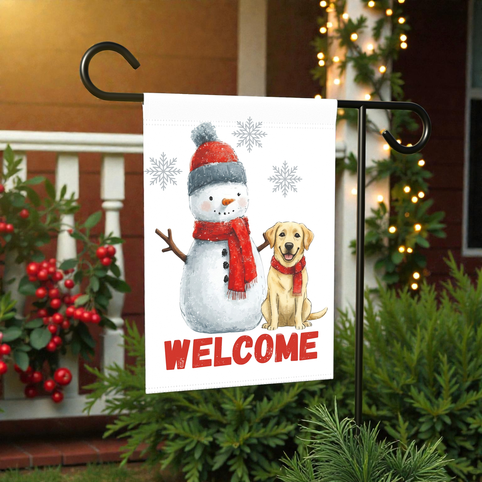 The Yellow Labrador and Snowman Welcome Garden Flag is a burst of pure, seasonal joy. Imagine your guests arriving to see this: a jolly, coal-eyed snowman and a smiling Yellow Lab sharing a moment of winter magic as gentle snowflakes drift around them. With its soft watercolor-style artwork and a cheerful “hello” vibe, it transforms your porch, walkway, or garden bed into a sanctuary of affection that feels like a warm hug on a chilly day.